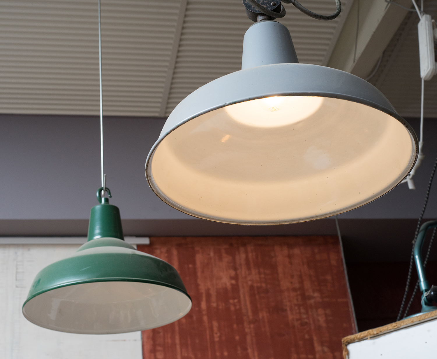 TWO EARLY 20th CENTURY INDUSTRIAL ENAMELLED CEILING LIGHTS