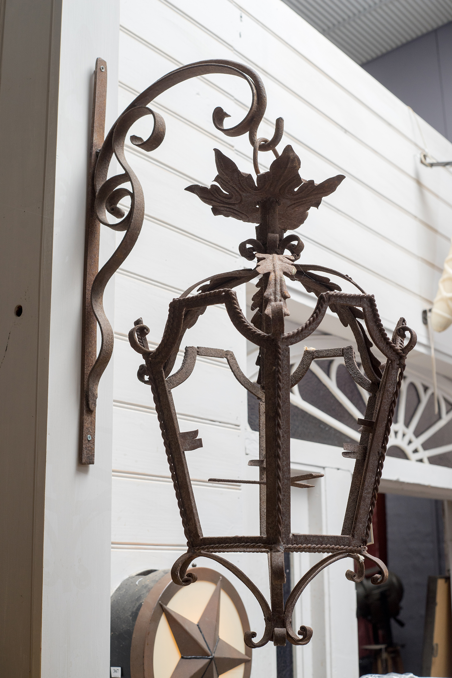 AN ORNATE FRENCH WROUGHT IRON LANTERN ON ORIGINAL BRACKET