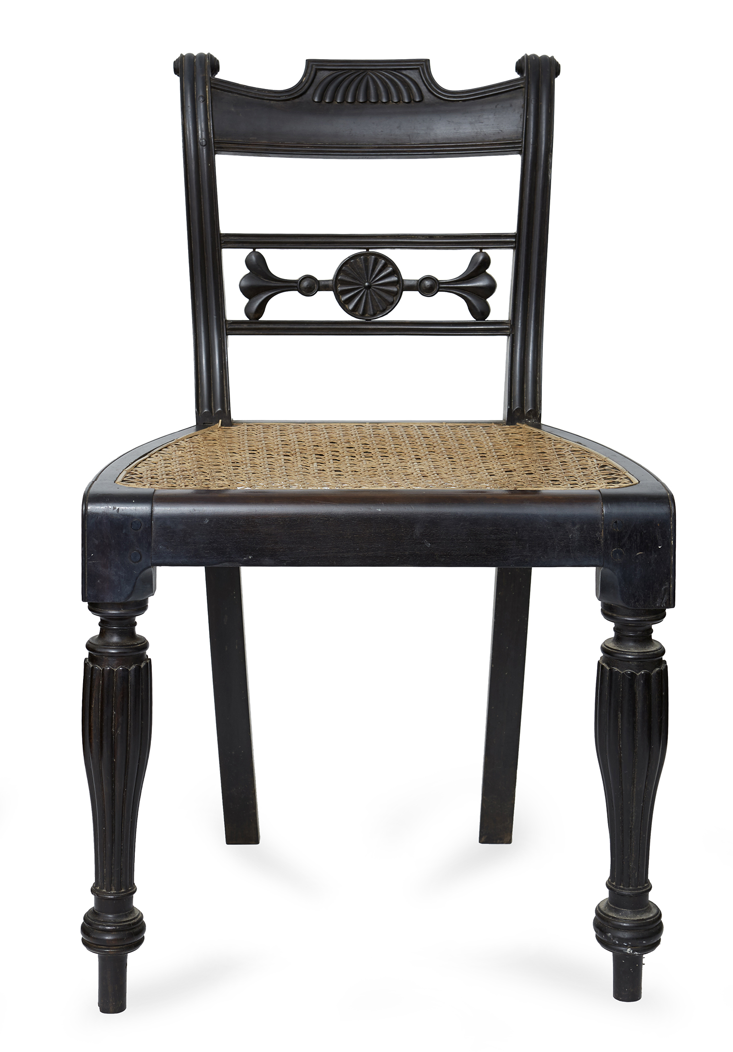 In the Regency manner with reeded shaped crest and open carved back splat, caned seat on turned and reeded legs