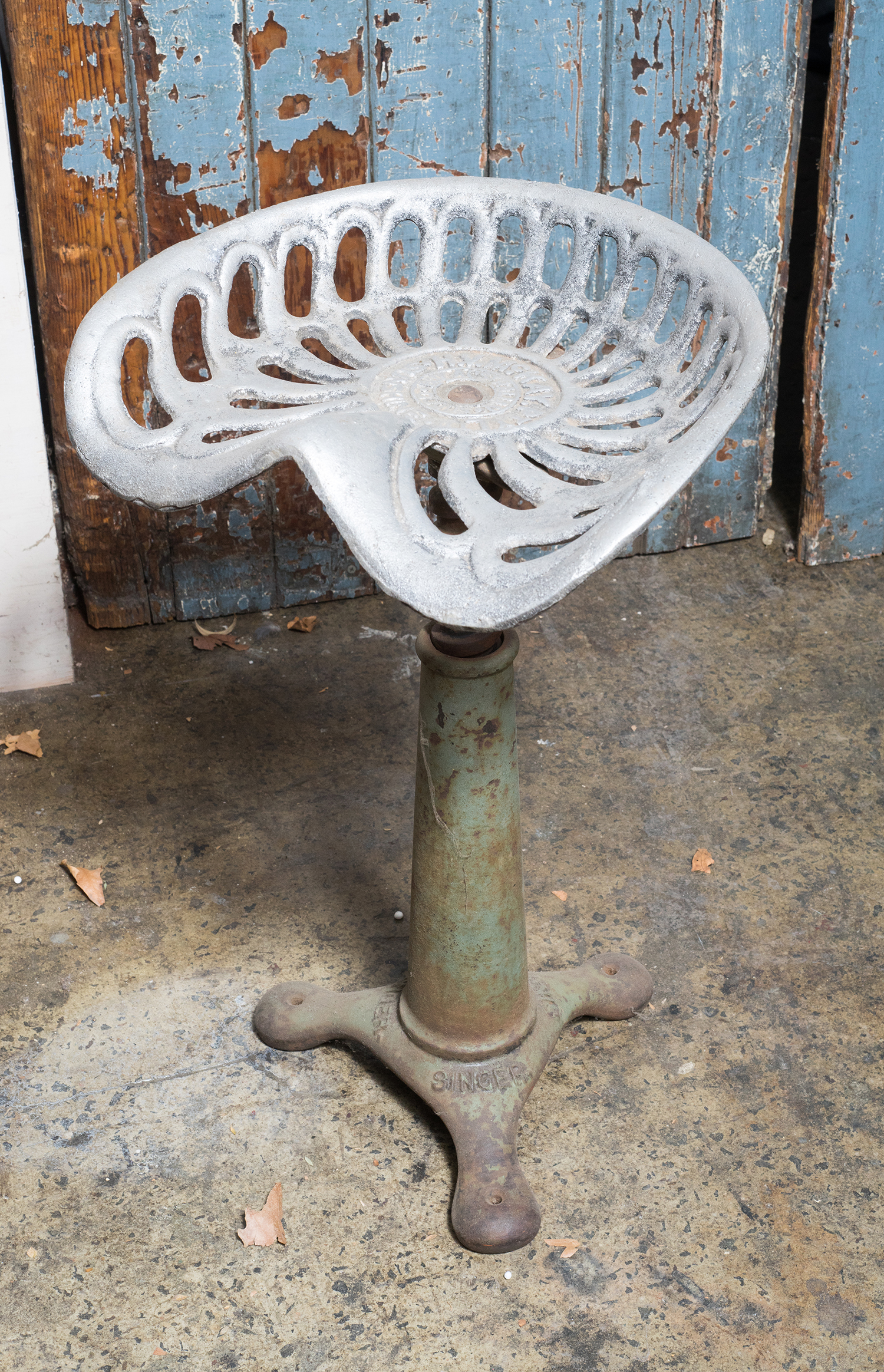 A VINTAGE H.V. McKAY TRACKER SEAT ON TRIPOD 'SINGER' BASE