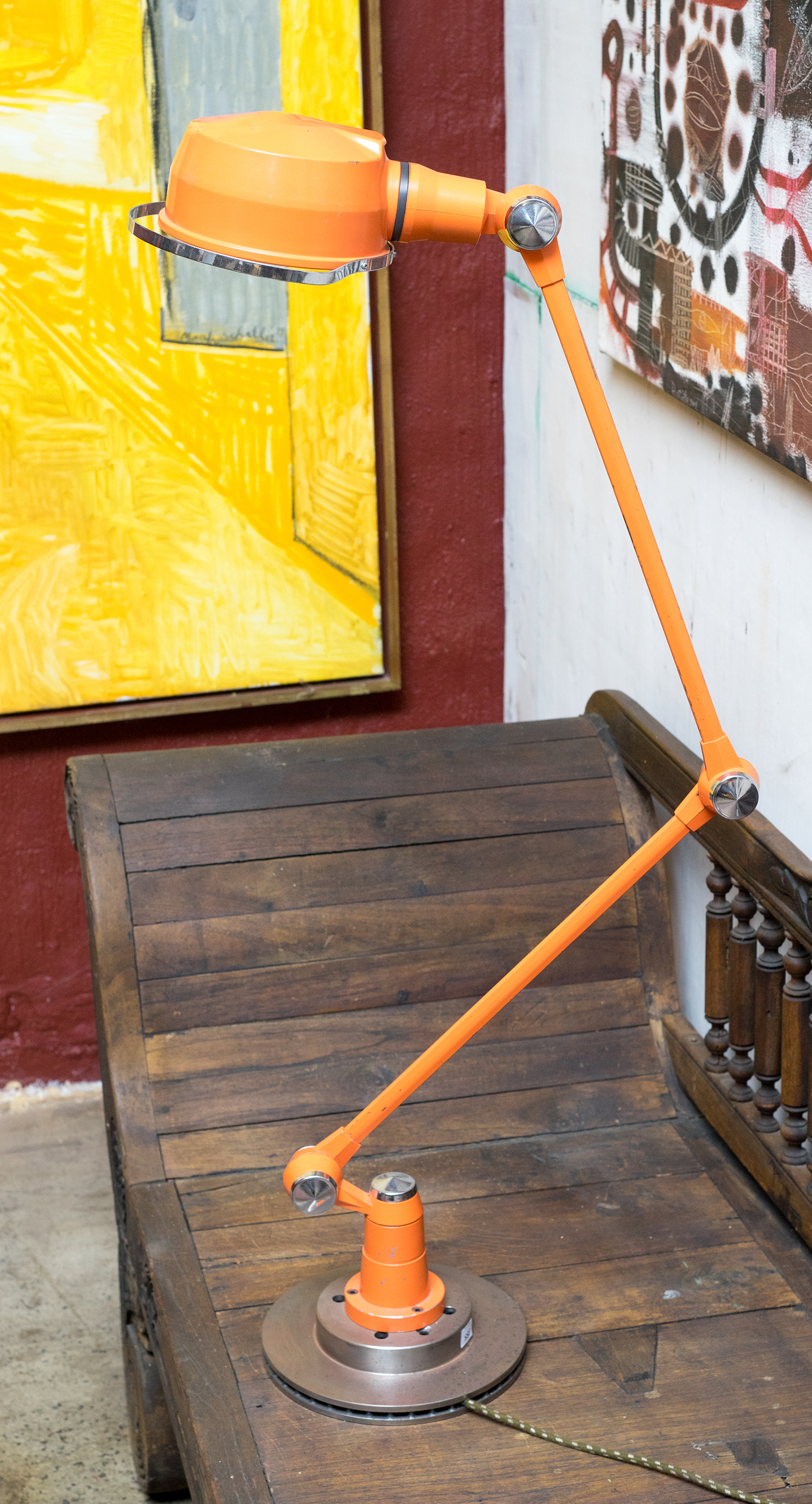 Orange painted metal on steel base