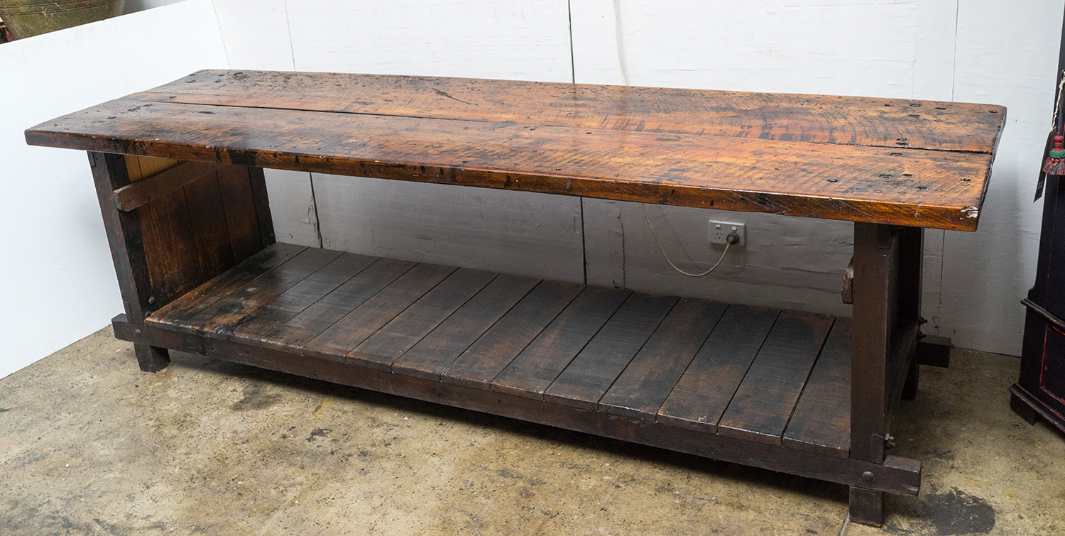 A MID CENTURY TWO TIER INDUSTRIAL WORKBENCH