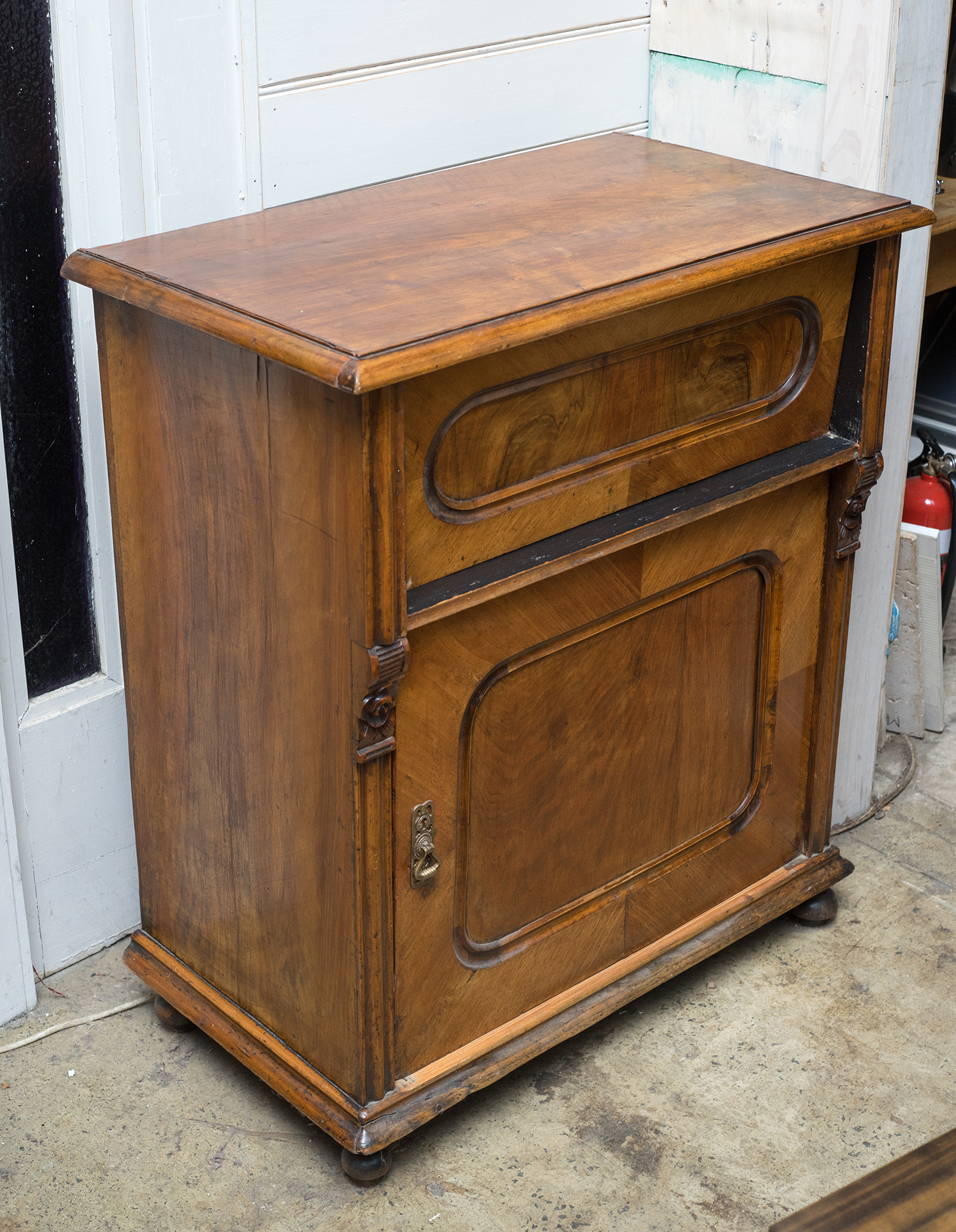The overall finish of this mahogany wash stand is very good, retaining its original veneers. However, the veneer on the underside of the hinged lid shows signs of fraying, and the joinery of the edging is slightly separated at the corners. There also appears to be a superficial split and loss to the veneer on the left side panel, albeit consistent with the grain. Makes for a rustic finish.