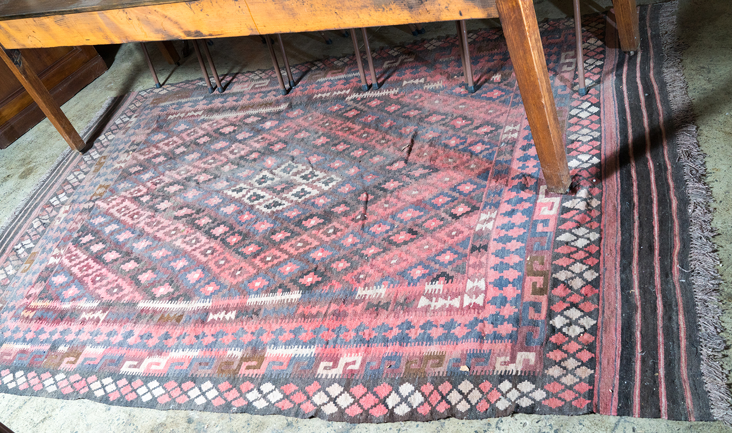 In its current state, this Afghani Kilim appears to be in good shape, although it would really benefit from a thorough cleaning to best accentuate its subtle earthy palette. There appears to be slight sun fading in some of the central areas, when compared with the edges. All the tassels are intact.