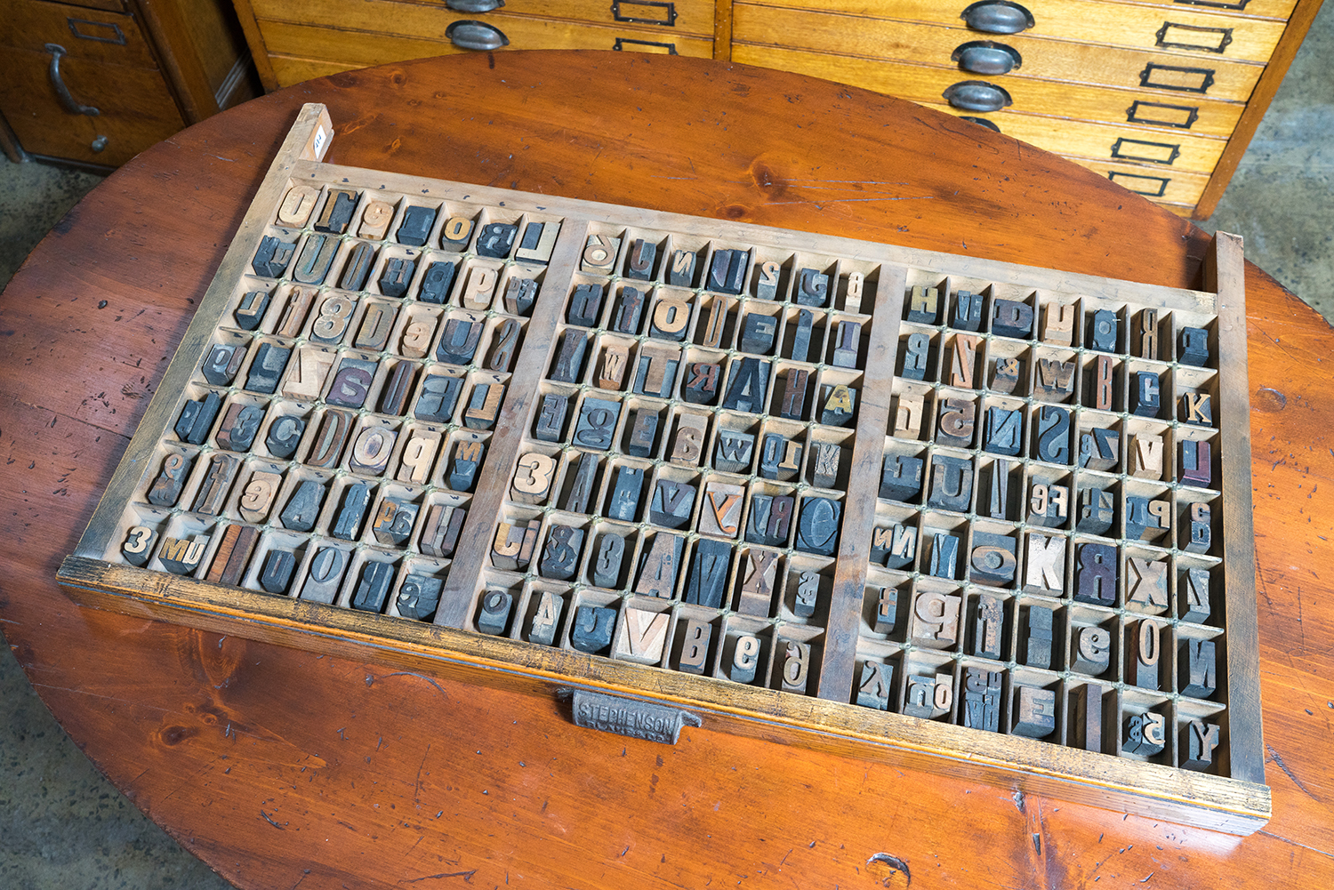 The drawer containing the stamps is in fine shape, complete with all crosspiece capping. The stamps are all of various typefaces, and appear to have various histories of use. Most are lightly glued to bottom of drawer for display, and some have come loose.