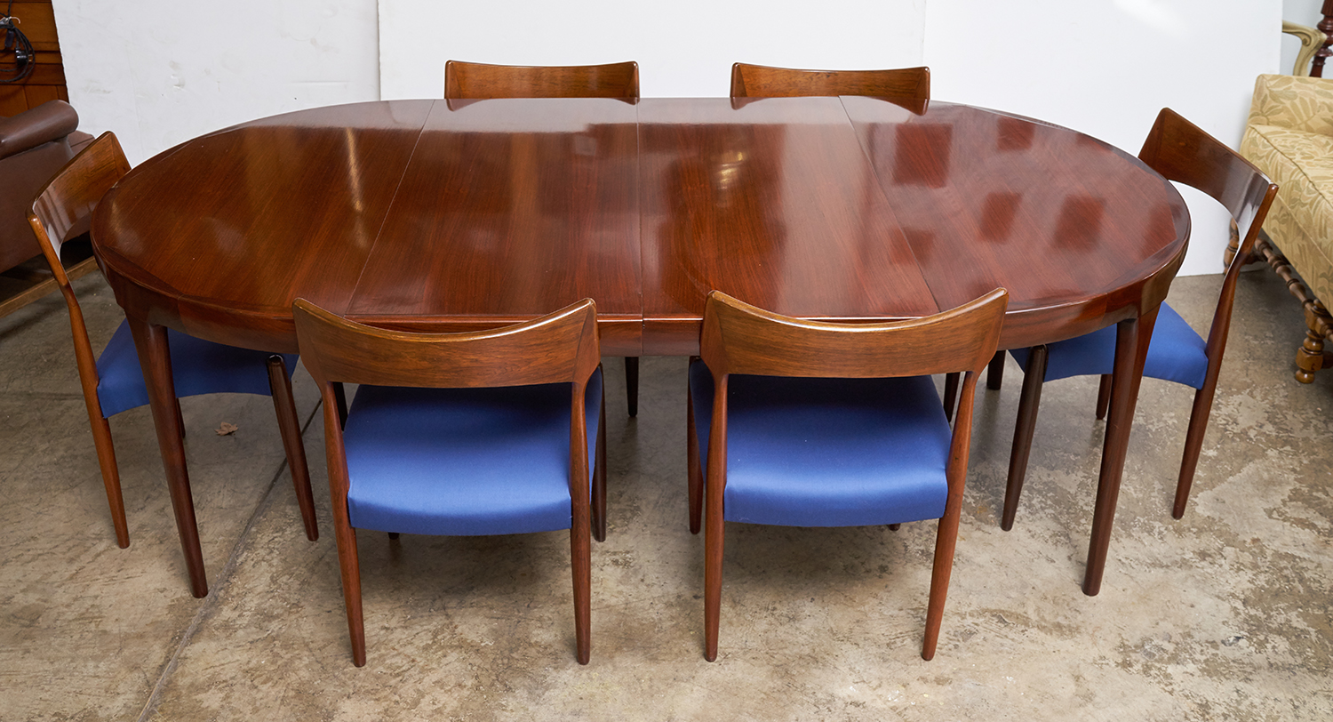 A 1960s DANISH IB KOFORD LARSEN EXTENTION DINING TABLE AND SIX CHAIRS