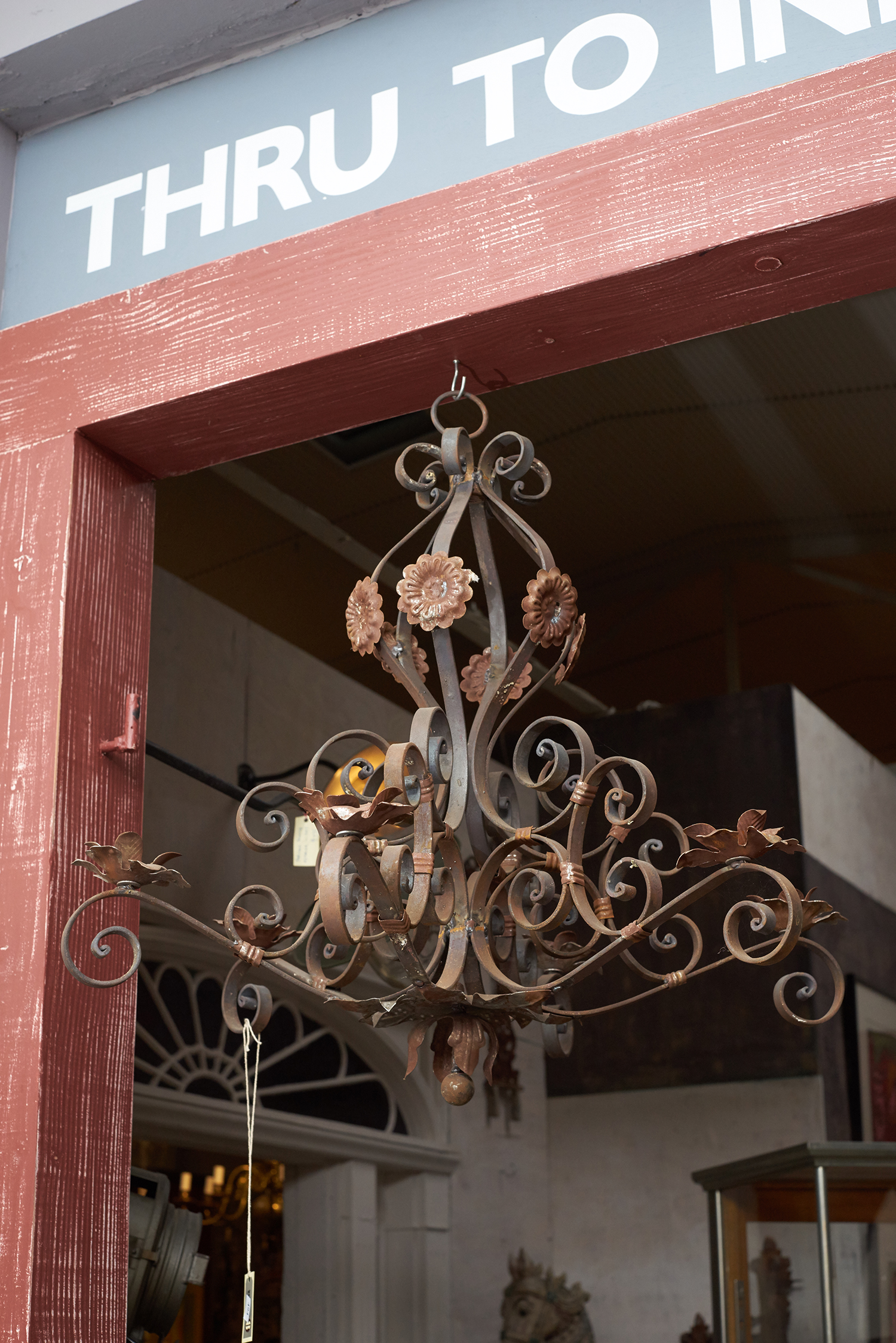 A MID CENTURY WROUGHT IRON SIX BRANCH CANDELABRA