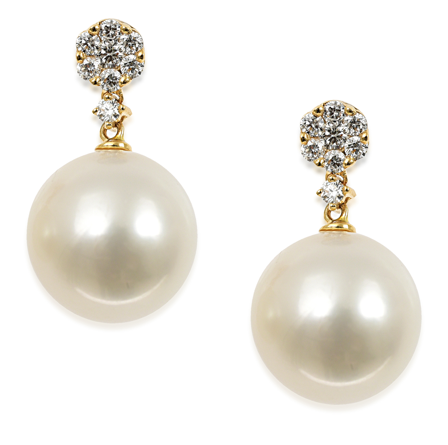 Each round pearl of silver and white hue measuring 13mm, suspended from a diamond cluster fitting, mounted in 18ct yellow gold.