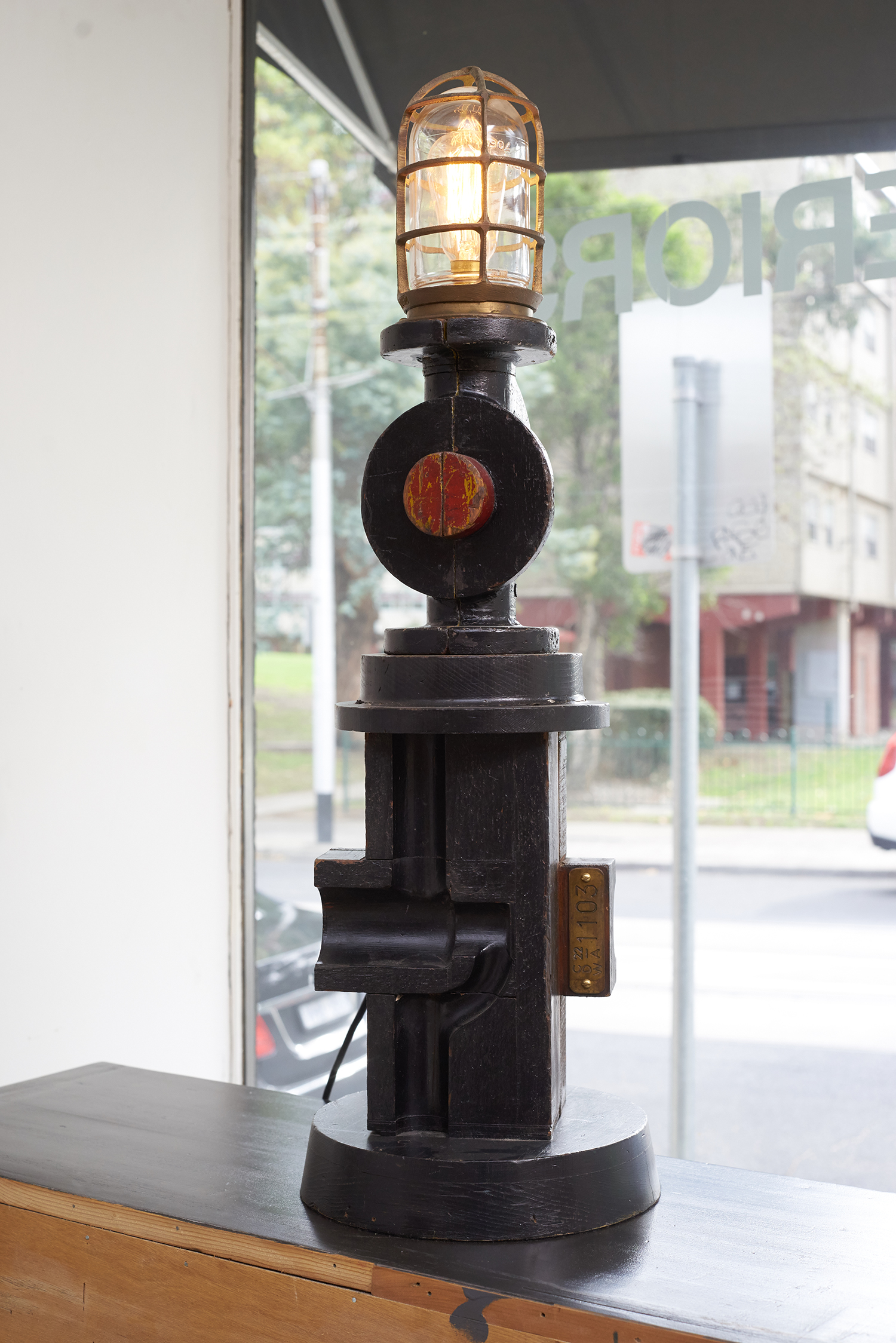 A BESPOKE INDUSTRIAL LAMP MADE FROM SALVAGED ELEMENTS