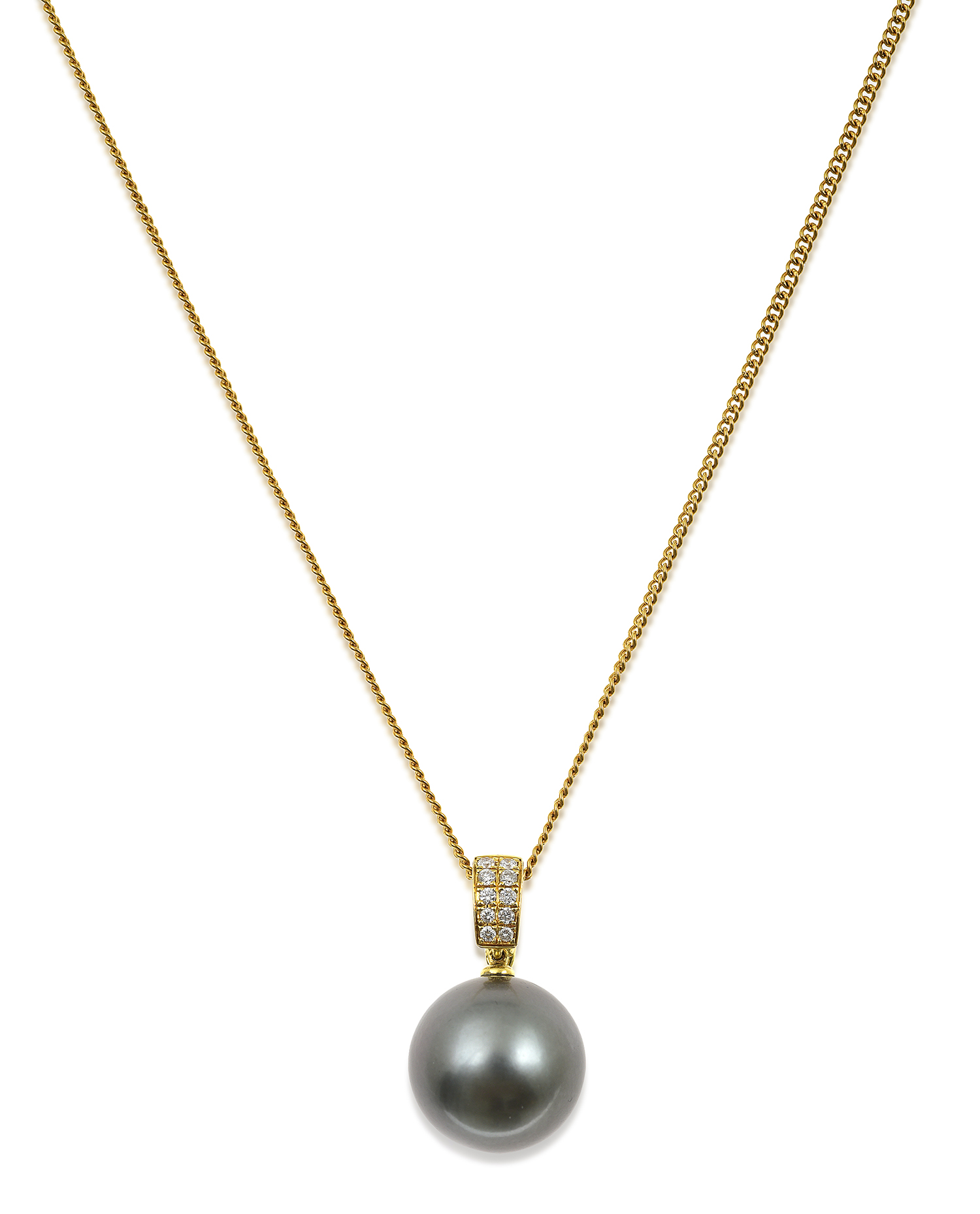 Comprising a round pearl of dark grey hue measuring 14.6mm, to a diamond set bale, mounted in 18ct yellow gold.