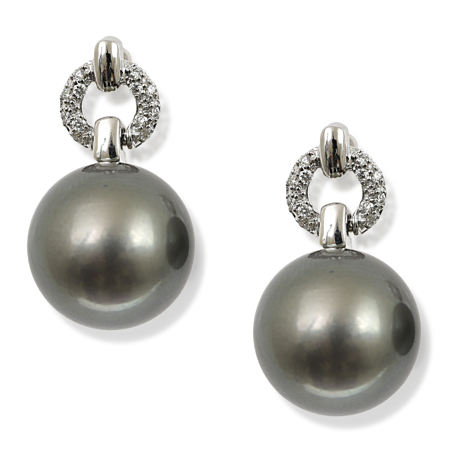 Each round pearl of grey hue measuring 13.8mm, to a diamond pave set fitting, mounted in 18ct white gold.