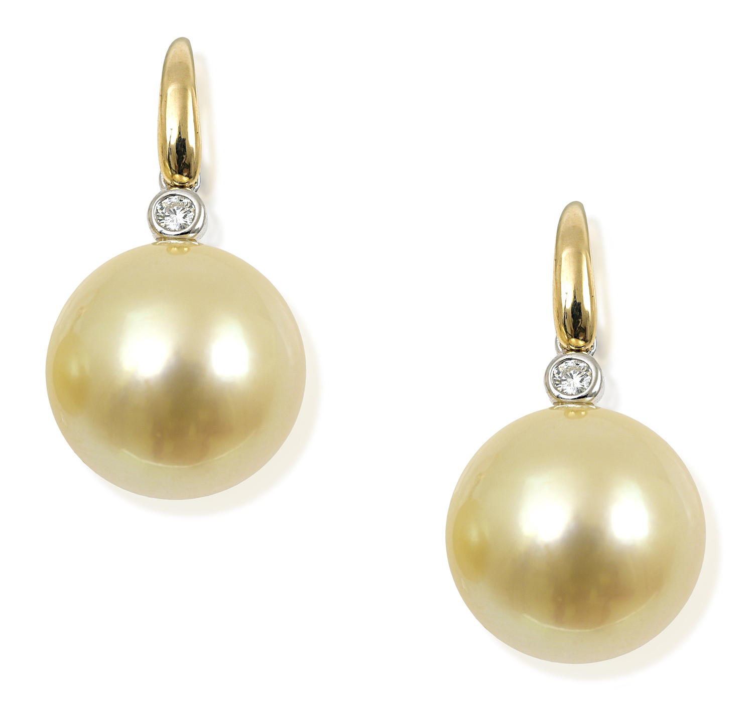 Each round pearl measuring 14mm, surmounted by a brilliant cut diamond, mounted in 14ct yellow gold.