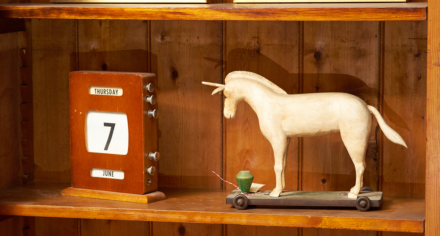 A HAND CARVED UNICORN AND VINTAGE CALENDAR