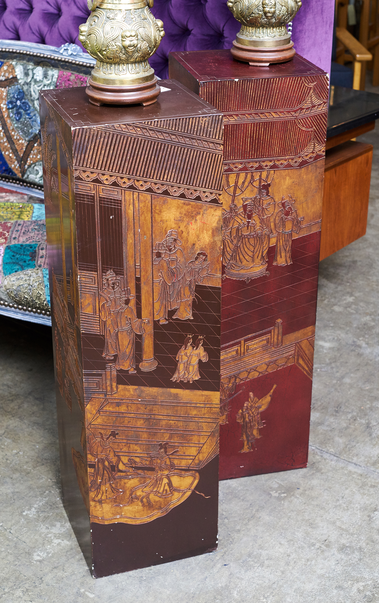 A PAIR OF MID 20th CENTURY AMERICAN HOLLYWOOD REGENCY PEDESTALS IN ORIENTAL MANOR