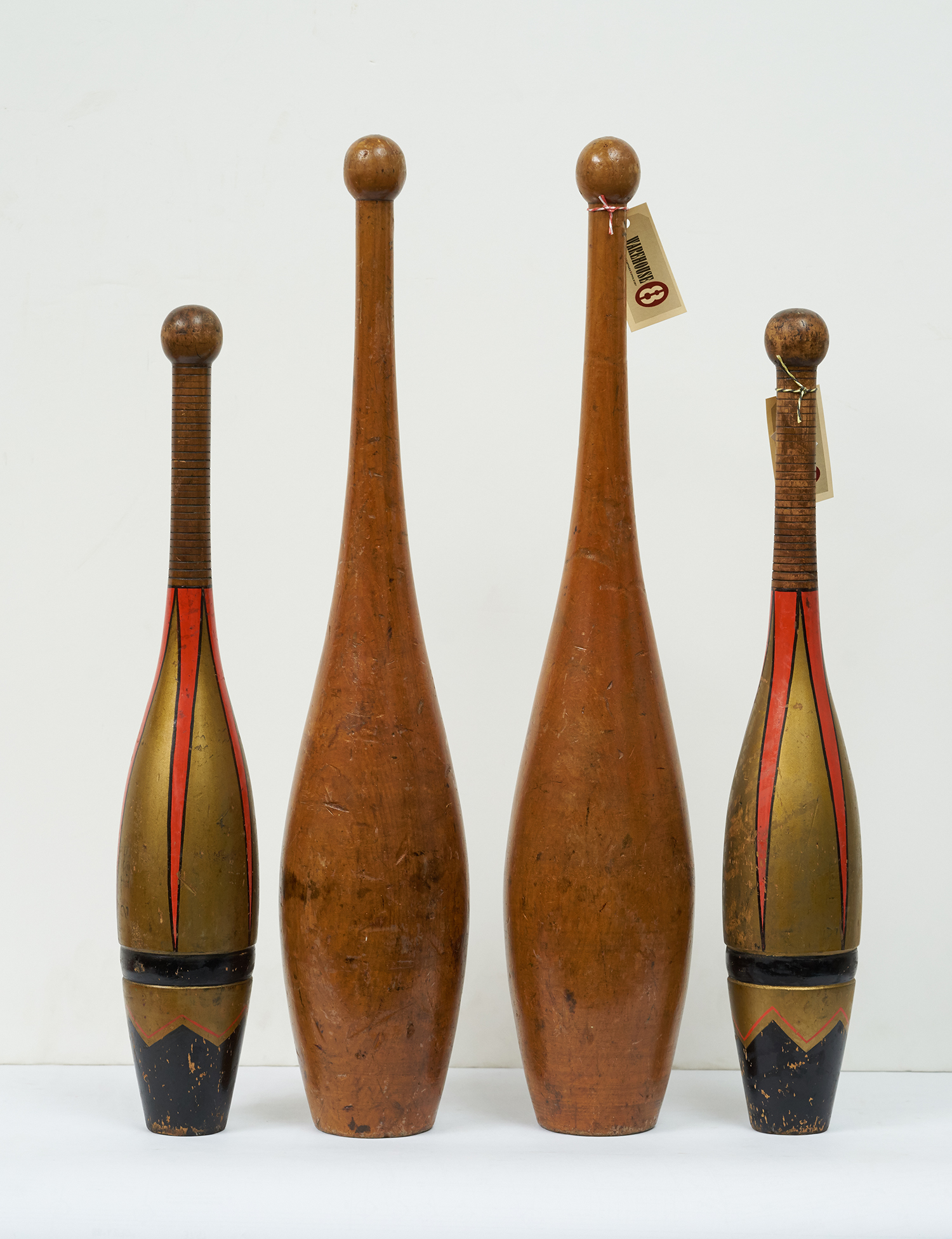 A PAIR OF 1920s AMERICAN IDIAN CLUBS AND A PAIR OF HAND PAINTED 1920s CLUBS