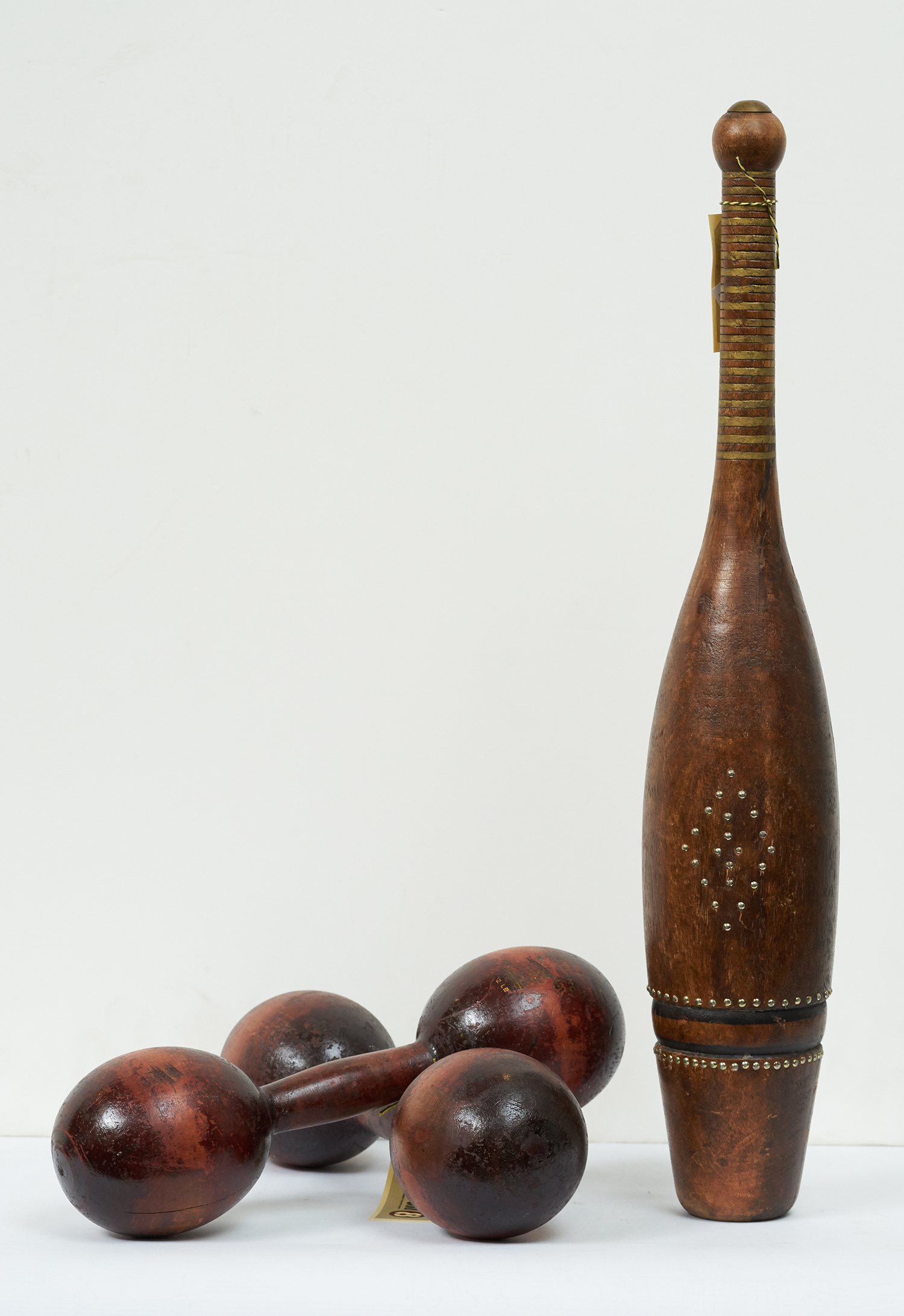 A 1920s PENSYLVANNIAN FOLK ART CLUB AND A PAIR OF FRENCH 1940s DUMBELLS