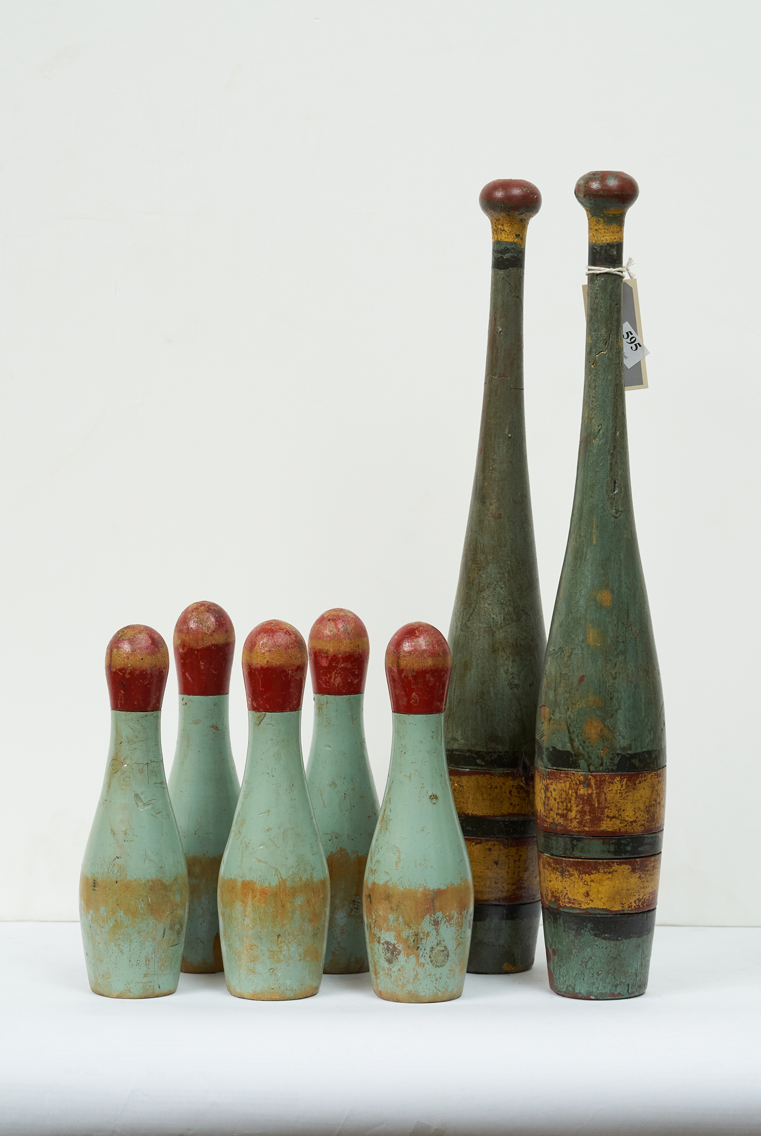 A PAIR OF HAND PAINTED AMERICAN INDIAN CLUBS AND FIVE MINIATURE CLUBS