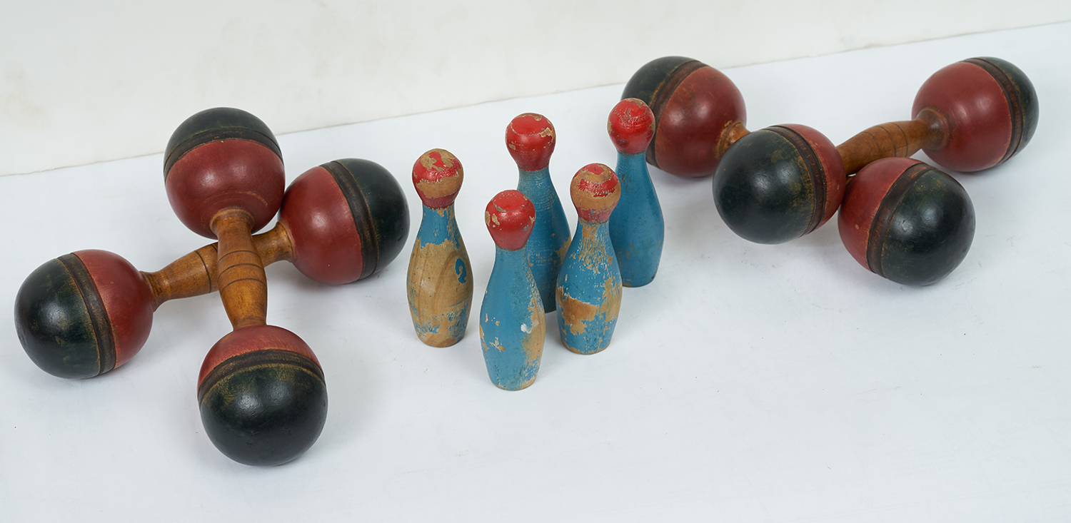 TWO PAIRS OF EARLY 20th CENTURY DUNBELLS AND FIVE MINIATURE SKITTLES