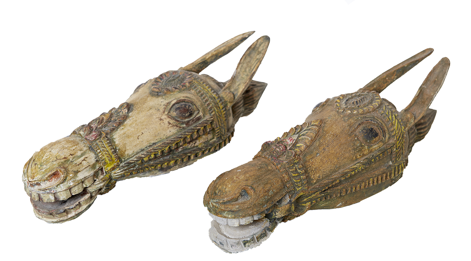 A PAIR OF INDIAN CARVED HORSES HEADS, LATE 19TH EARLY 20TH CENTURY