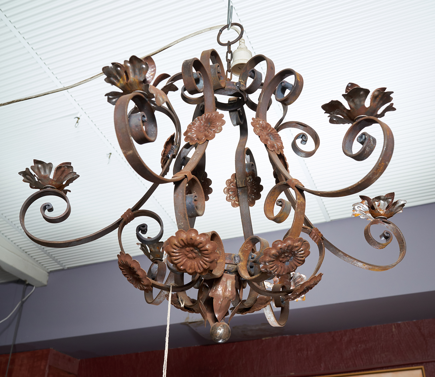 A DECORATIVE WROUGHT IRON SIX BRANCH CHANDELIER