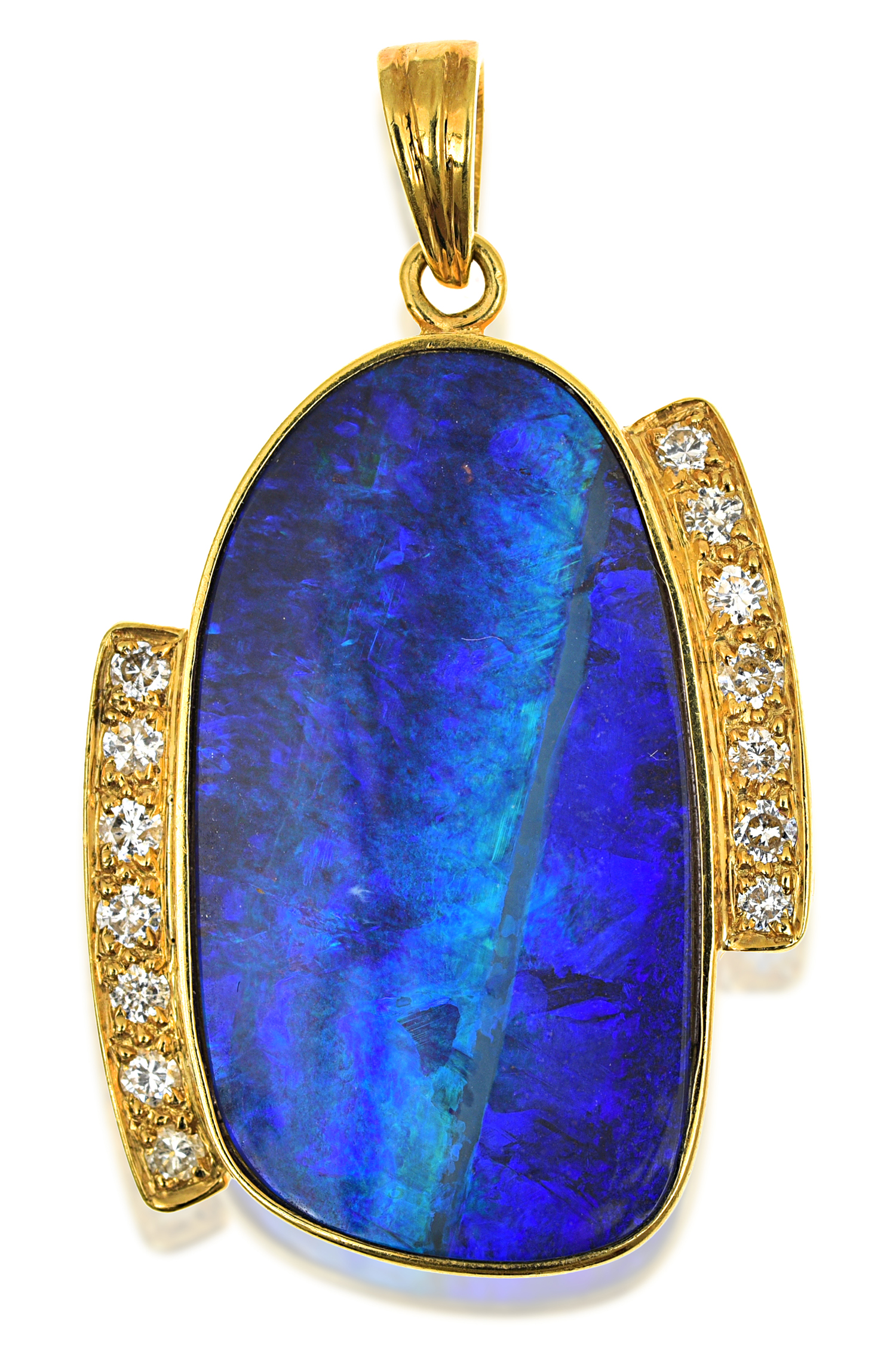 The free form polished opal displaying good play of colour offset by diamond detail, mounted in 18ct gold.