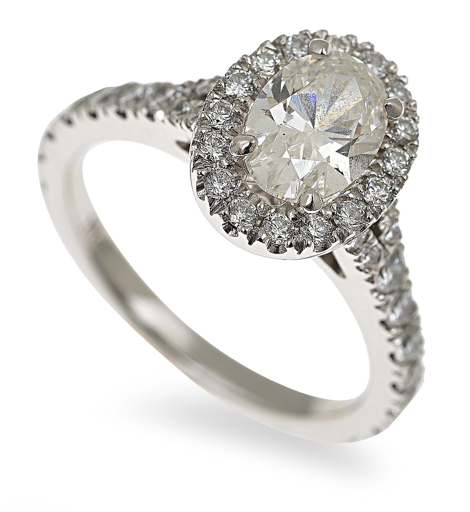 The oval cut diamond of 0.90cts, having further diamond detail set to the surround, mounted in 18ct white gold, ring size K, accompanied by a GIA certificate stating colour G, clarity SI1.