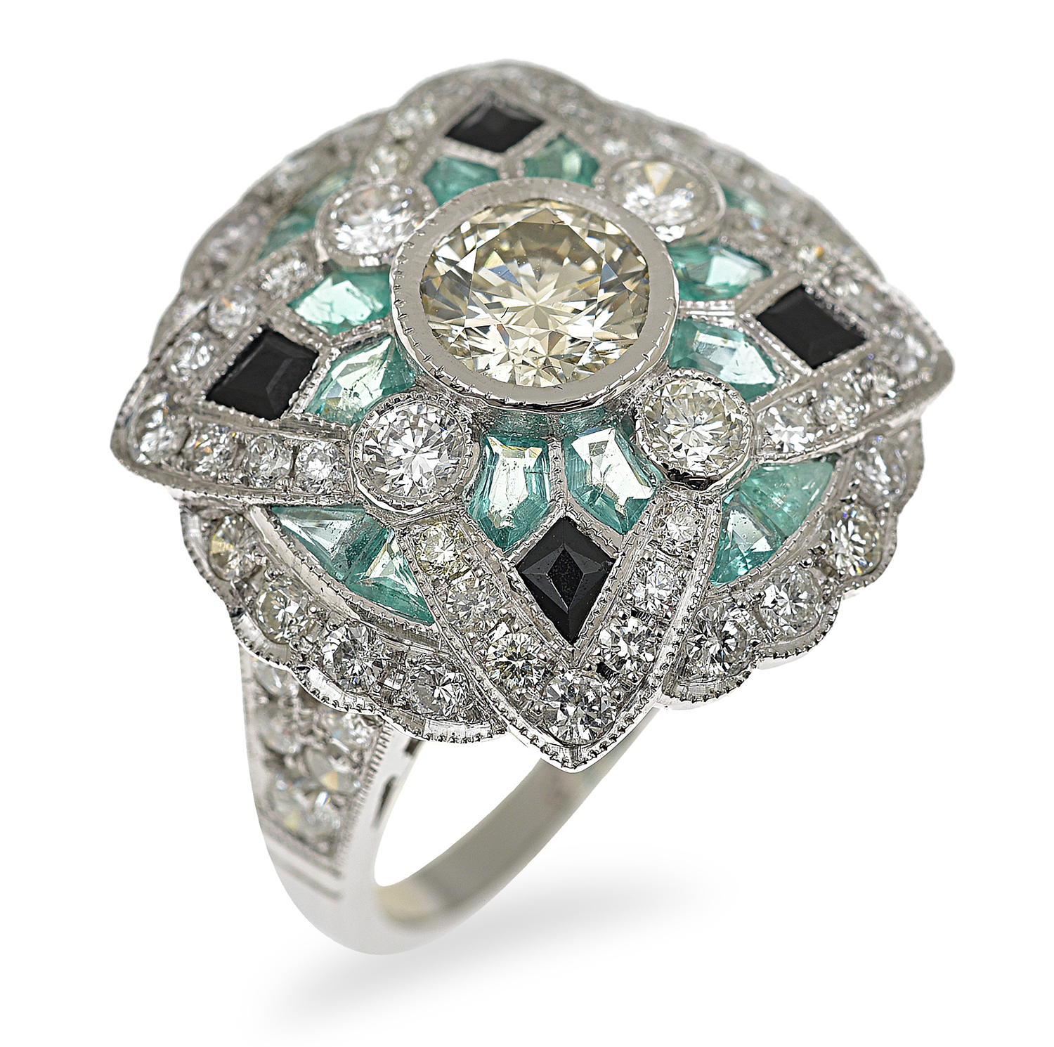 Centrally set with a round brilliant cut diamond of 0.65cts, surrounded by geometric panels with emerald, diamond and onyx detail, mounted in 18ct white gold, ring size M.