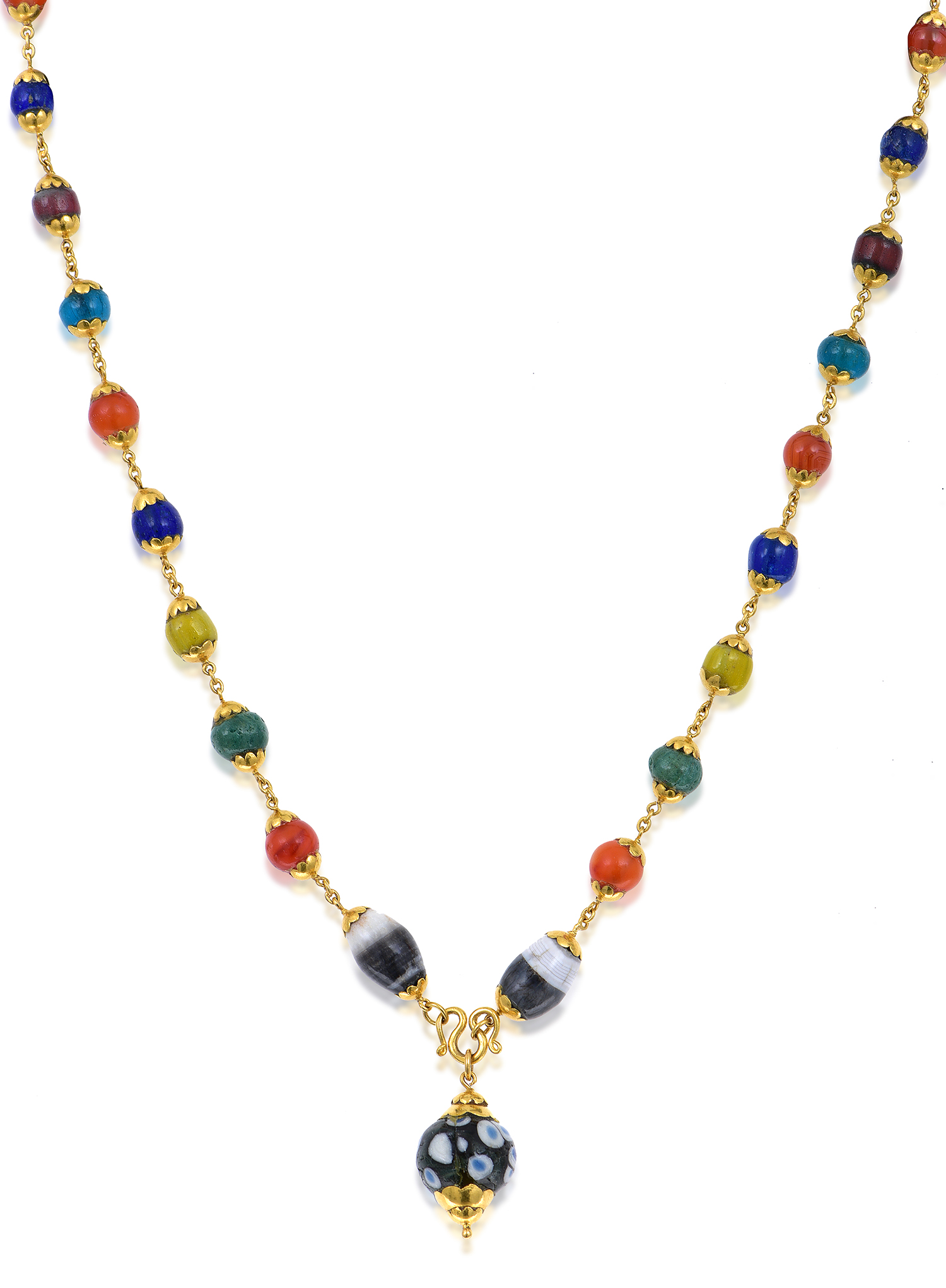 Featuring graduated multi-coloured polished glass beads with 22ct gold detail throughout, total length 700mm.