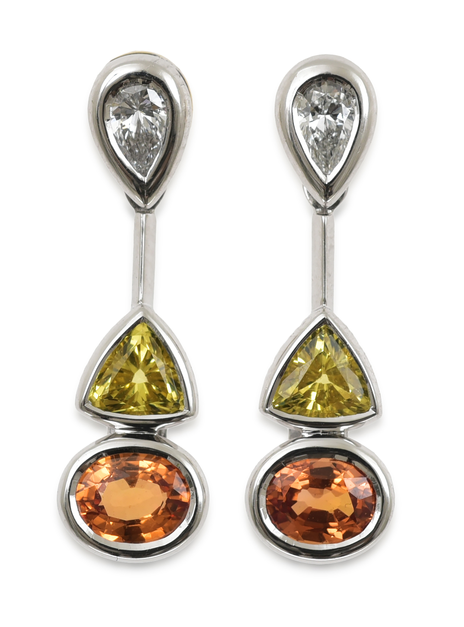 Each earring featuring an oval cut orange sapphire and a trilliant cut yellow sapphire suspended from a pear cut diamond, mounted in 18ct white gold.
