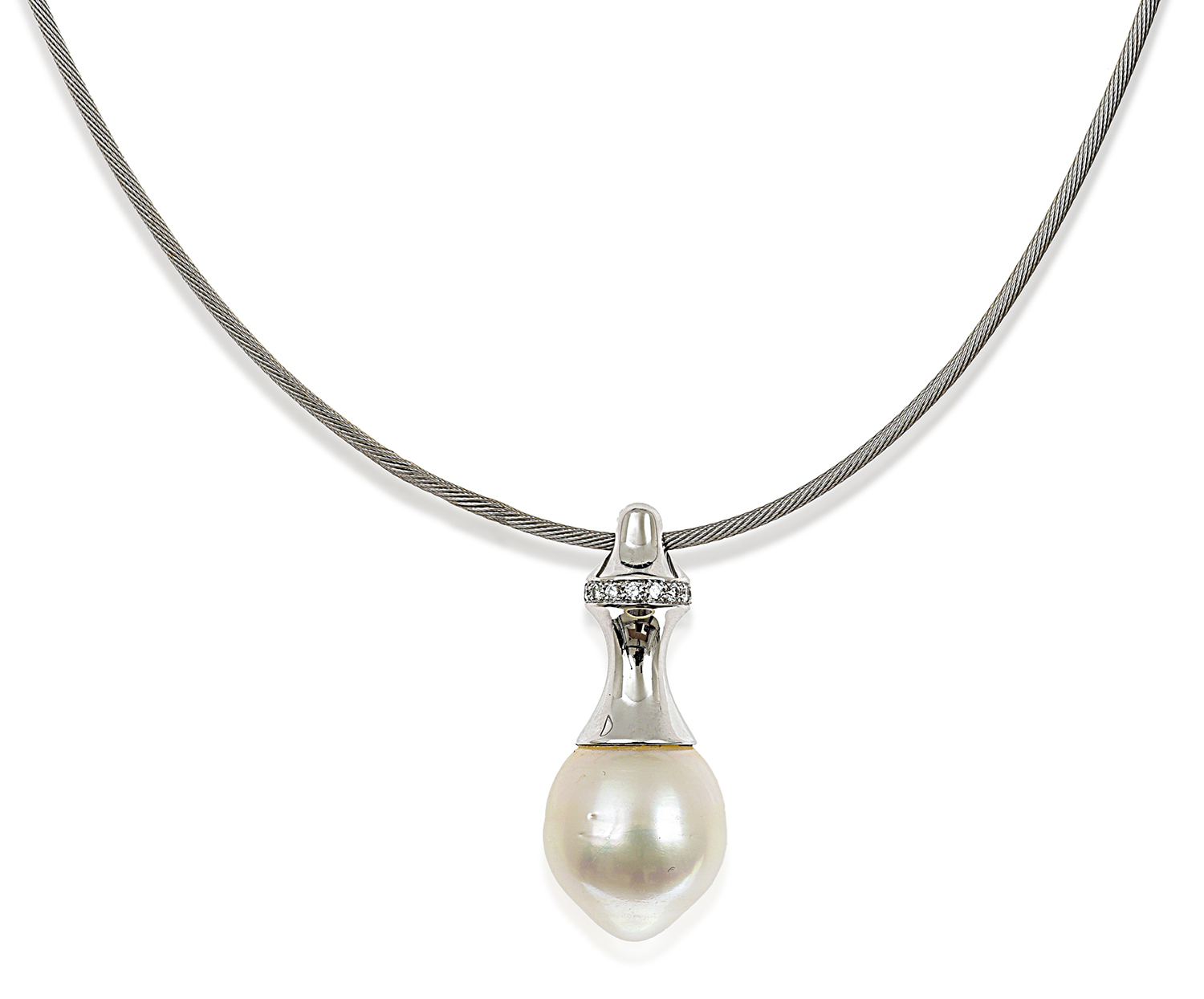 The baroque pearl of white and cream hue measuring 18.70mm, having diamond detail to the surmount, suspended from an omega collar, all mounted in 18ct white gold.