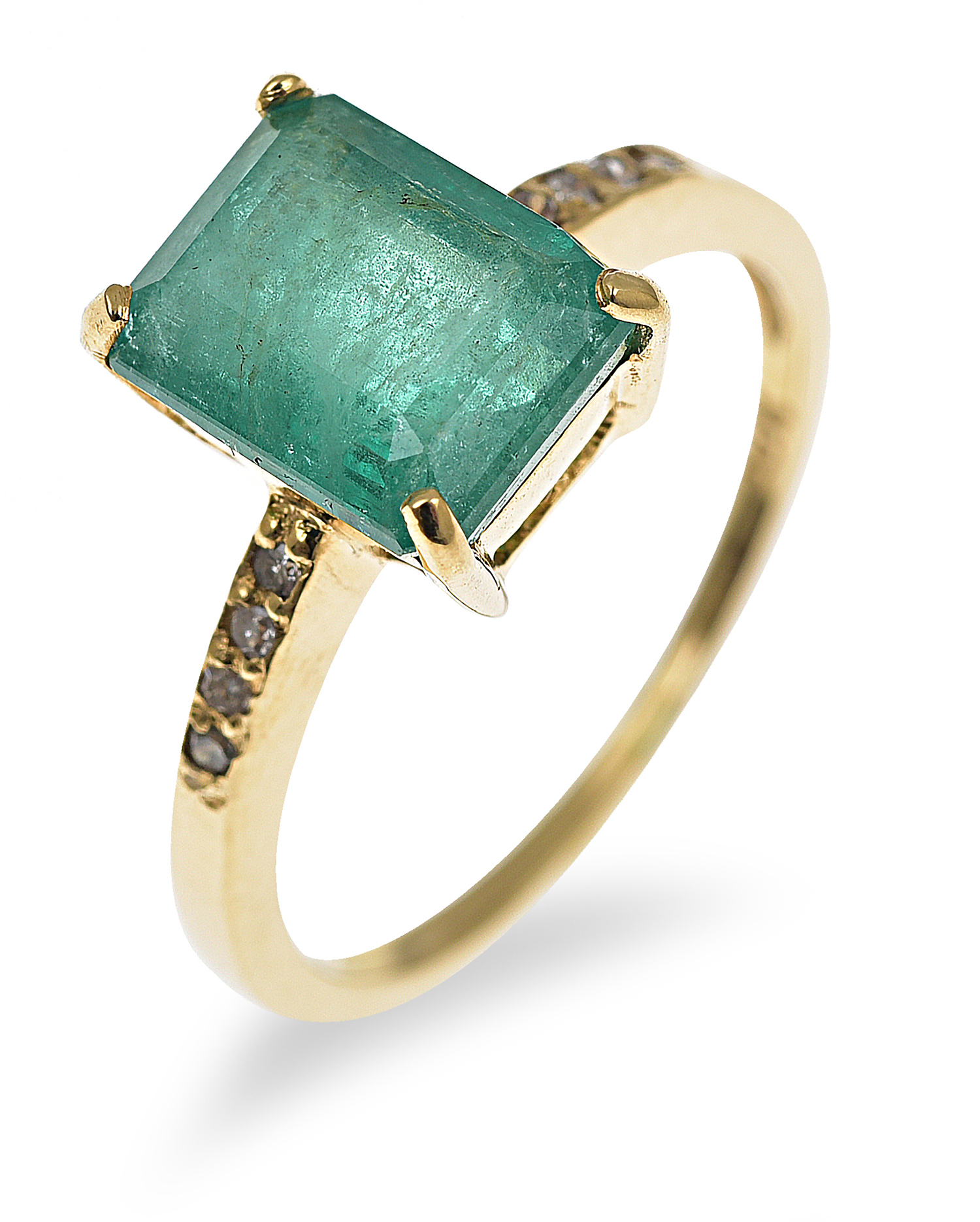 The emerald cut emerald of 2.00cts, having diamond detail to the shoulders, mounted in 18ct gold, ring size L.