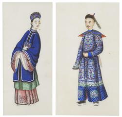 Finely detailed and painted in natural pigments, depicted wearing Royal court garments, 11.5 x 20cm and 8 x 19cm within mounts, (2)