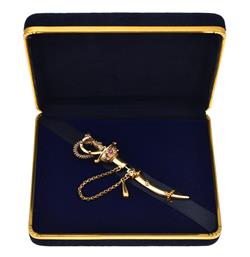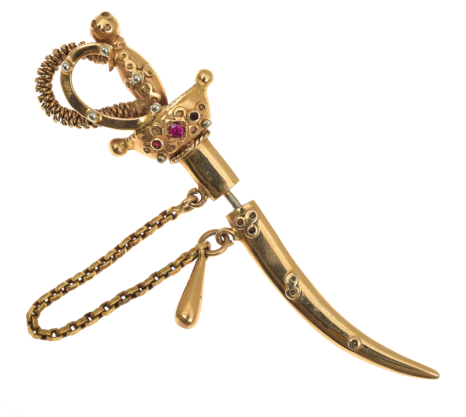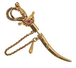Styled as a sword and scabbard, set with small rubies, mounted in 18ct gold, length 70mm.