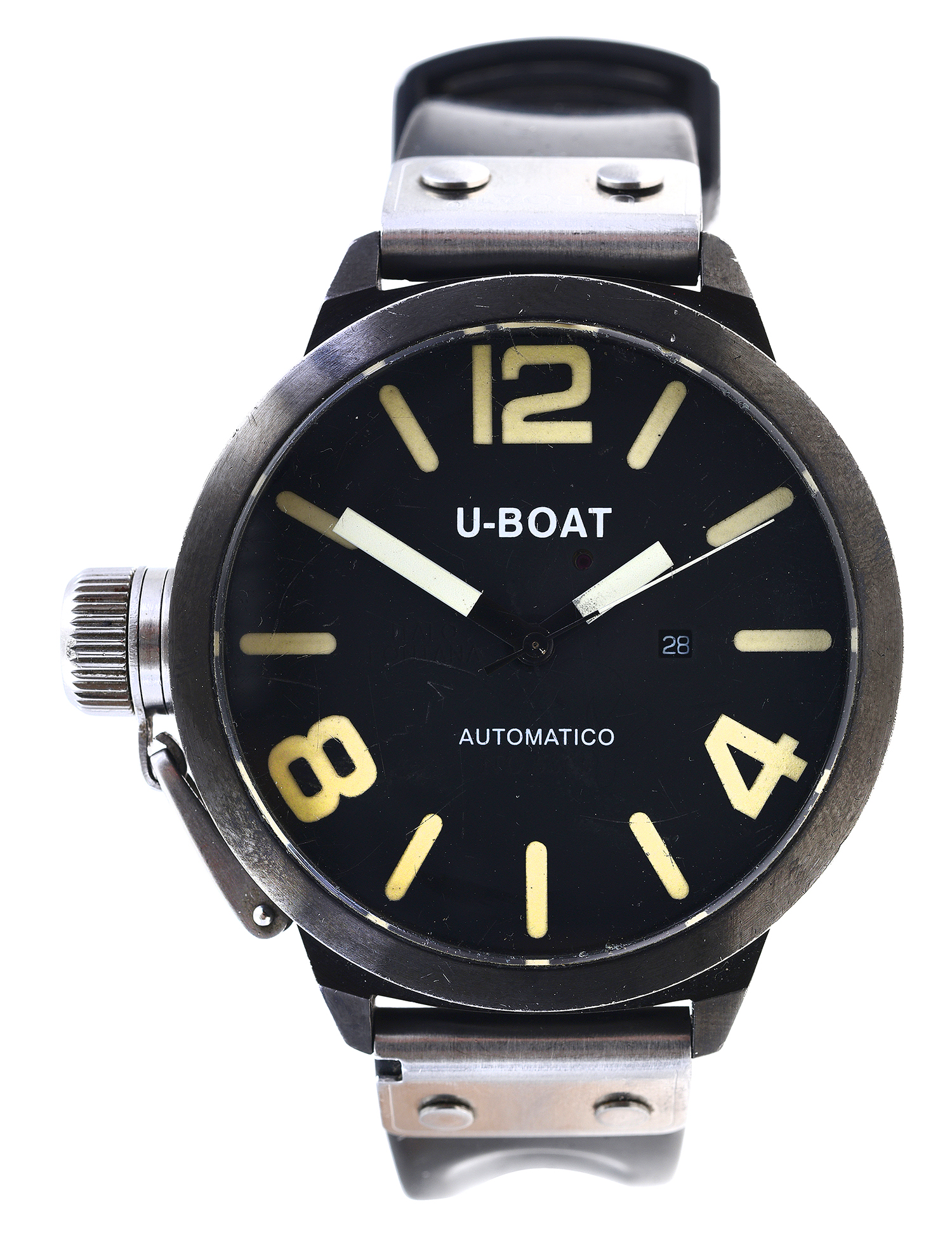Automatic movement, circular black dial with illuminated baton and Arabic numerals, lock down crown, black ceramic case, stainless steel lugs and neoprene bands and deployment clasp, 52mm diameter.