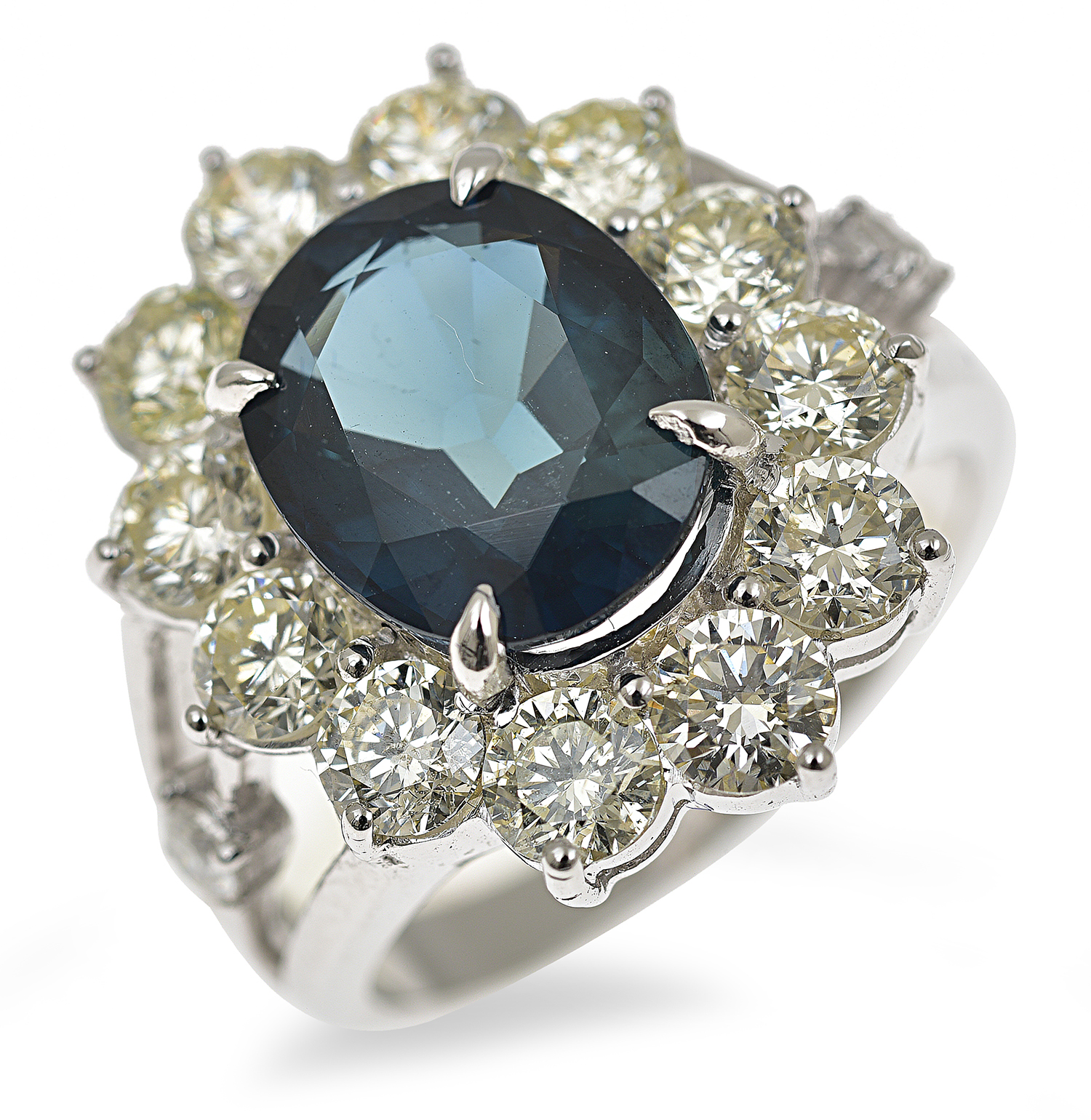 The oval cut sapphire of 4.25cts having round brilliant cut diamonds set to the surround and split shoulders, mounted in 18ct white gold, ring size M-N.
