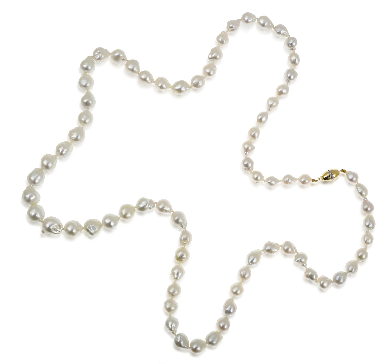 Comprising seventy-two graduated pearls of silver and white hues, measuring 8.30mm to 10.30mm to a gold clasp in 9ct gold, total length 920mm.