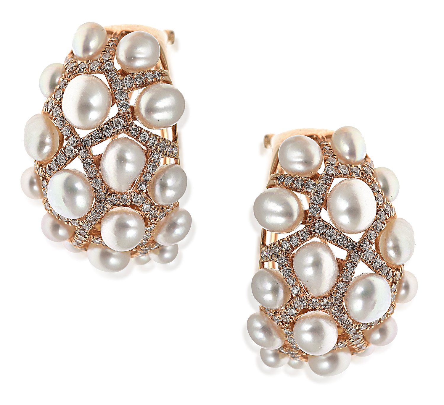 Each earring comprising eighteen pearls of silver and grey hues within a network of diamond set webbing totalling 0.80cts, to post and clip fittings in 18ct rose gold.