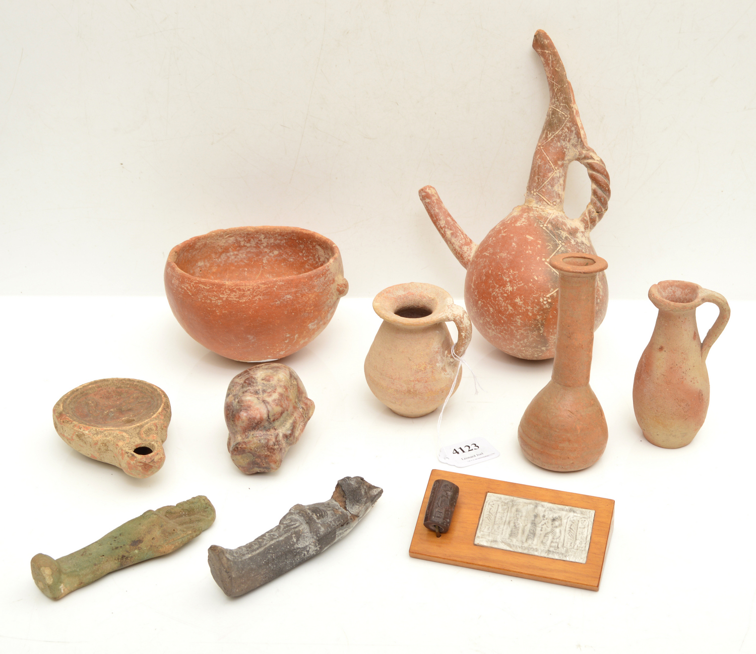 Comprising a Roman oil lamp, two Egyptian Shabti, a ewer possibly Etruscan, four pottery vesselsa carved bust and 'Egyptian' bead and plaque mounted on stand (10)