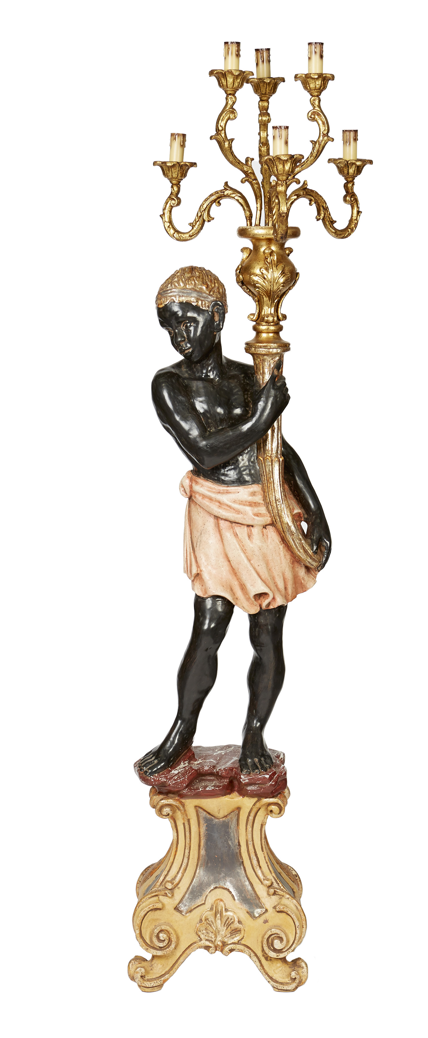 A 20TH CENTURY POLYCHROME AND GILDED BLACKAMOOR STANDING TORCHERE