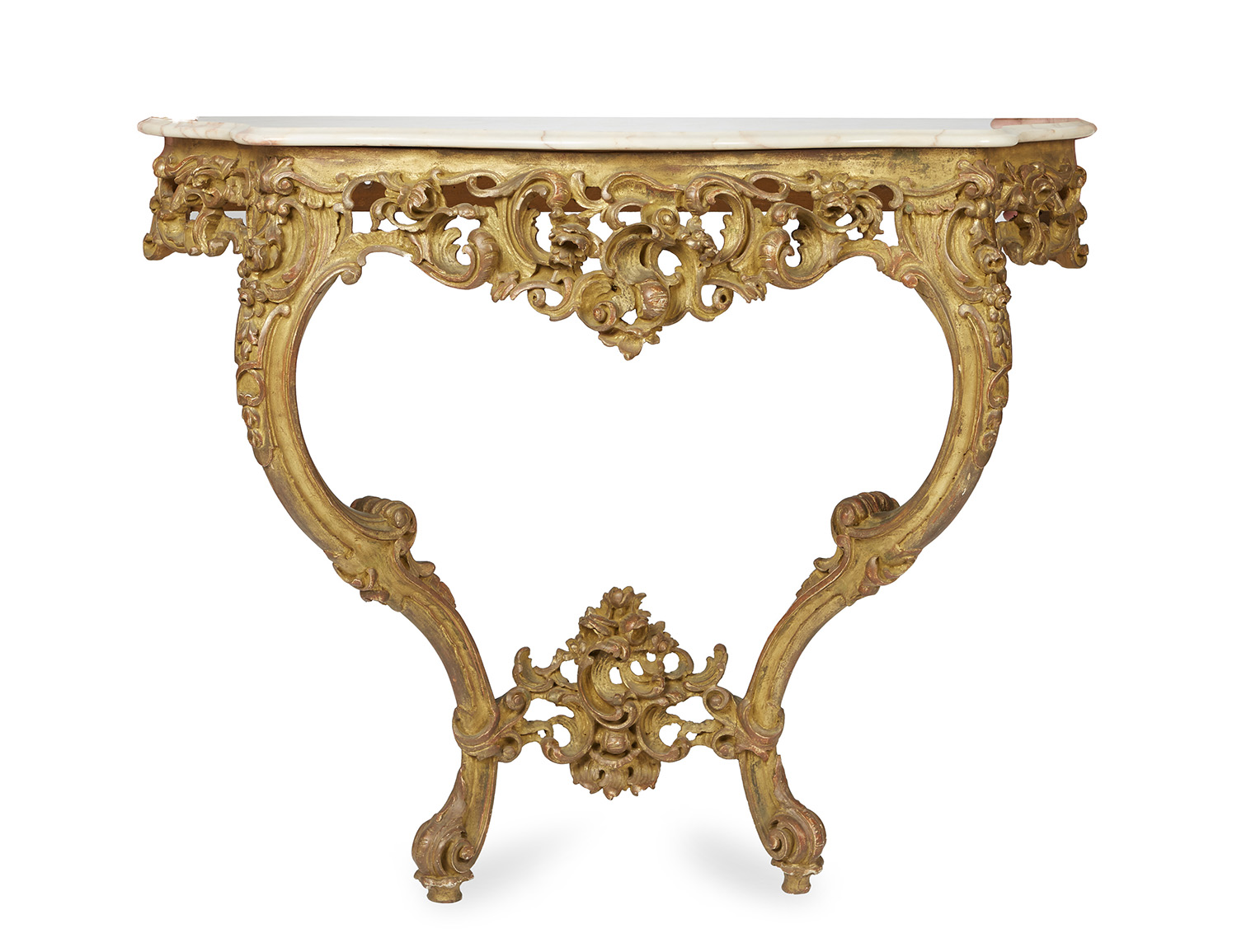 A LOUIS XV STYLE MARBLE TOPPED GILTWOOD CONSOLE TABLE