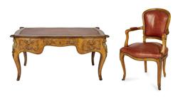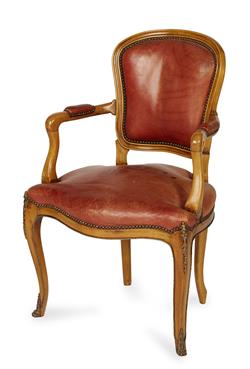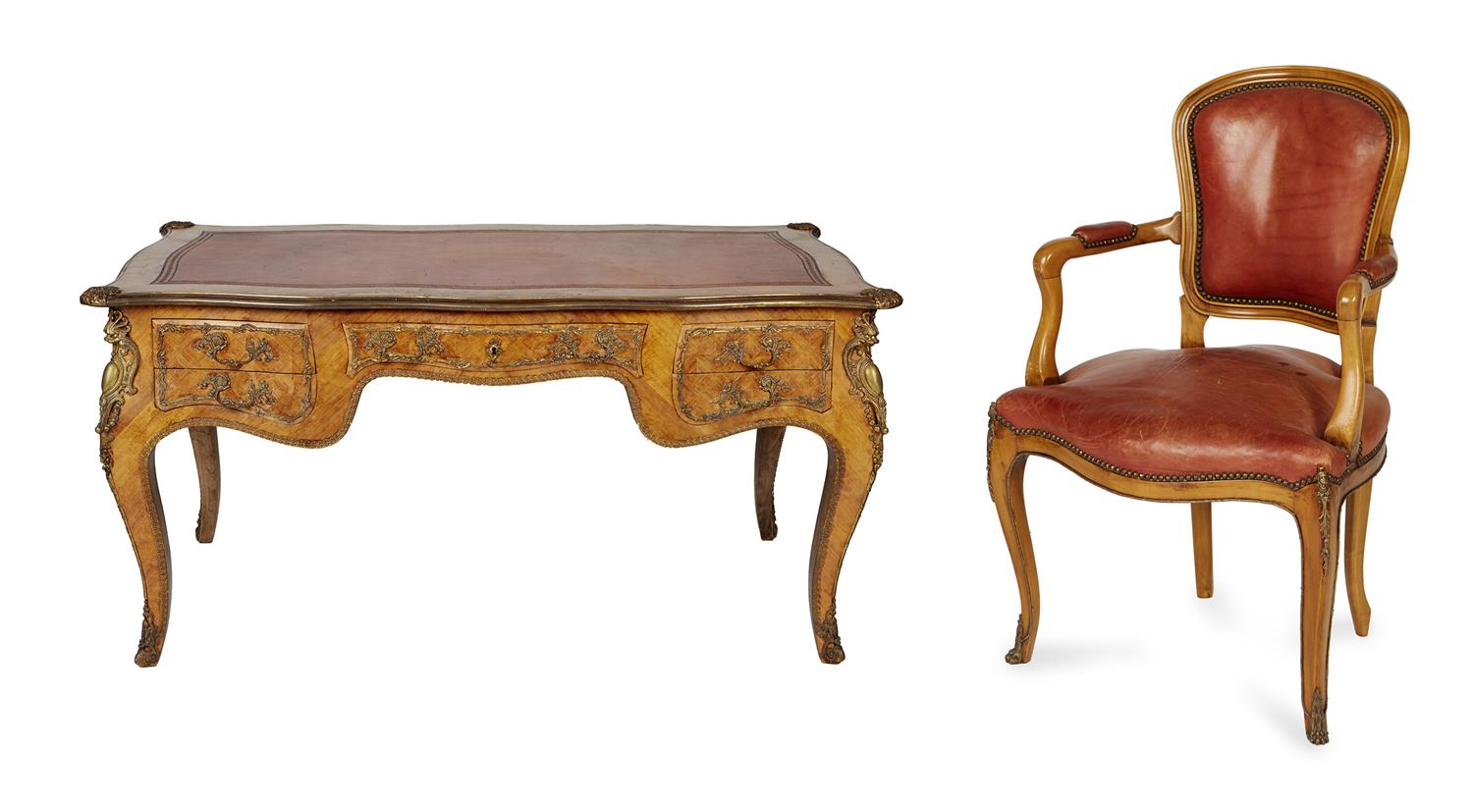 Together with matched leather upholstered chair with gilt mounts, (2)