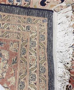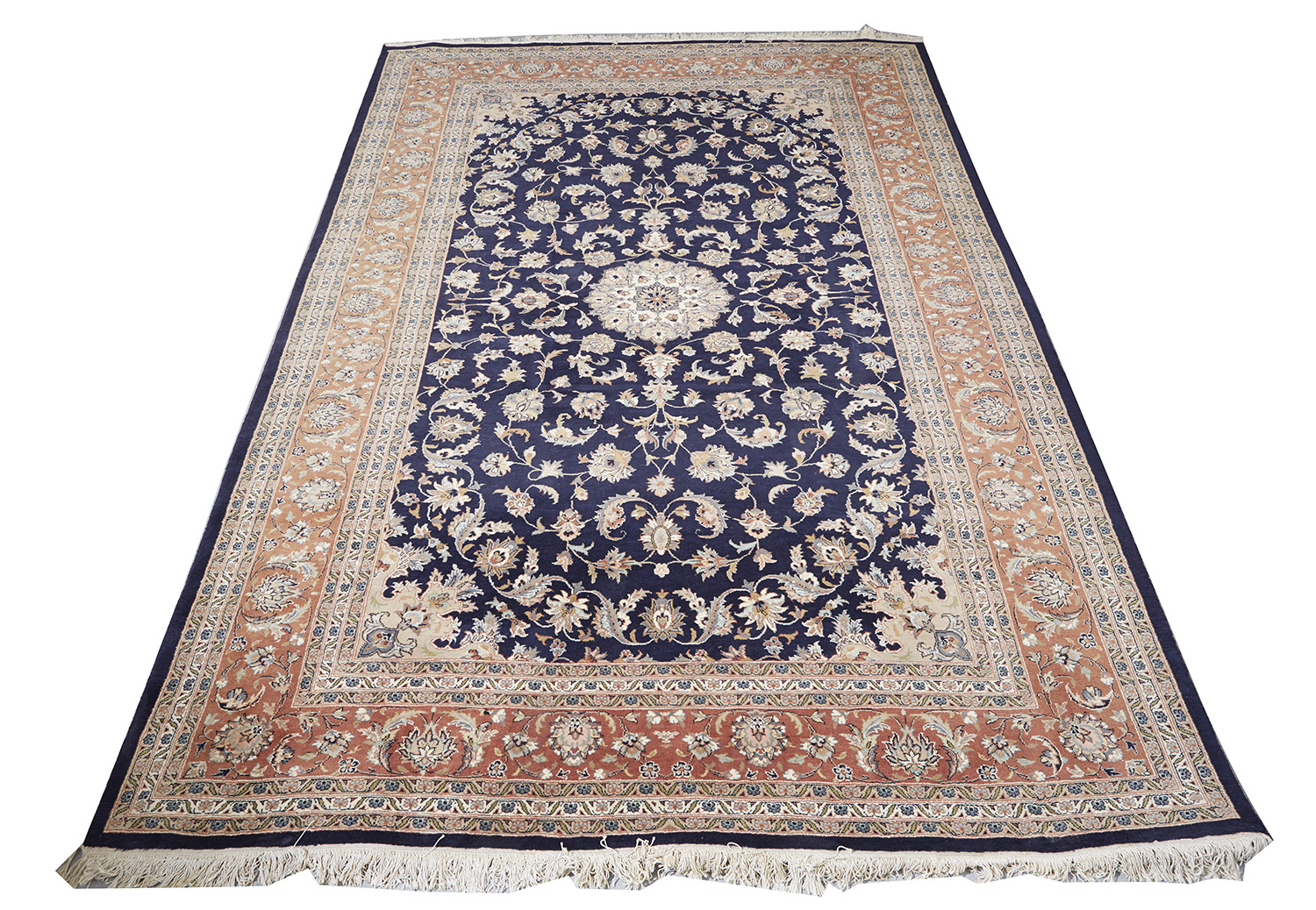 With central emanating floral design on blue ground within coral ground border, 246 x 360cm