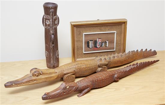 Comprising two carved crocodiles, a group painting on bark and a totem, crocodile 71cm length (4)