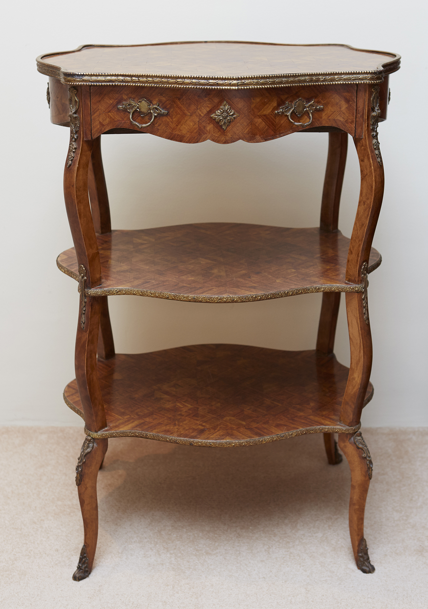 With brass mounts, the shaped top above serpentine fronted drawer and concentric stretcher shelves, 55 width x 41 depth x 80cm height