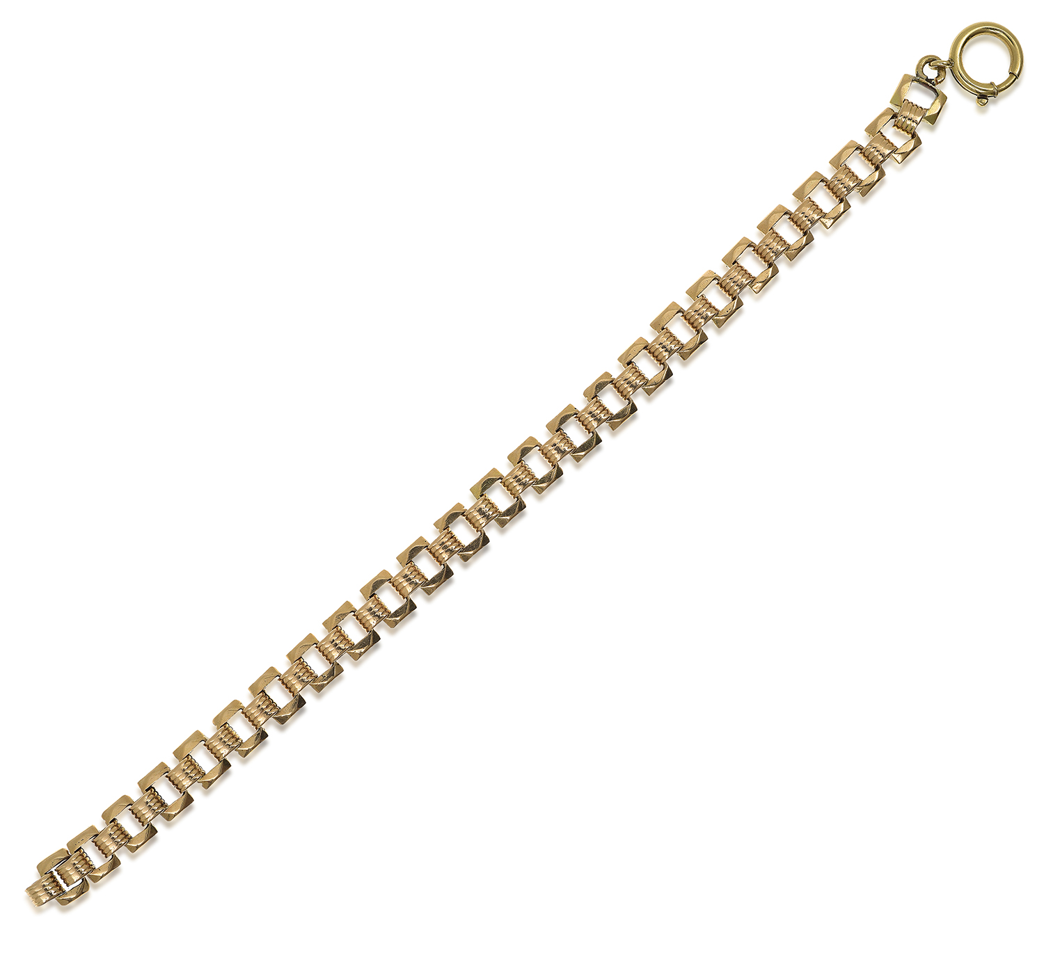 The geometric box link bracelet having polished and reeded decoration, mounted in 14ct rose gold, total length 190mm.
