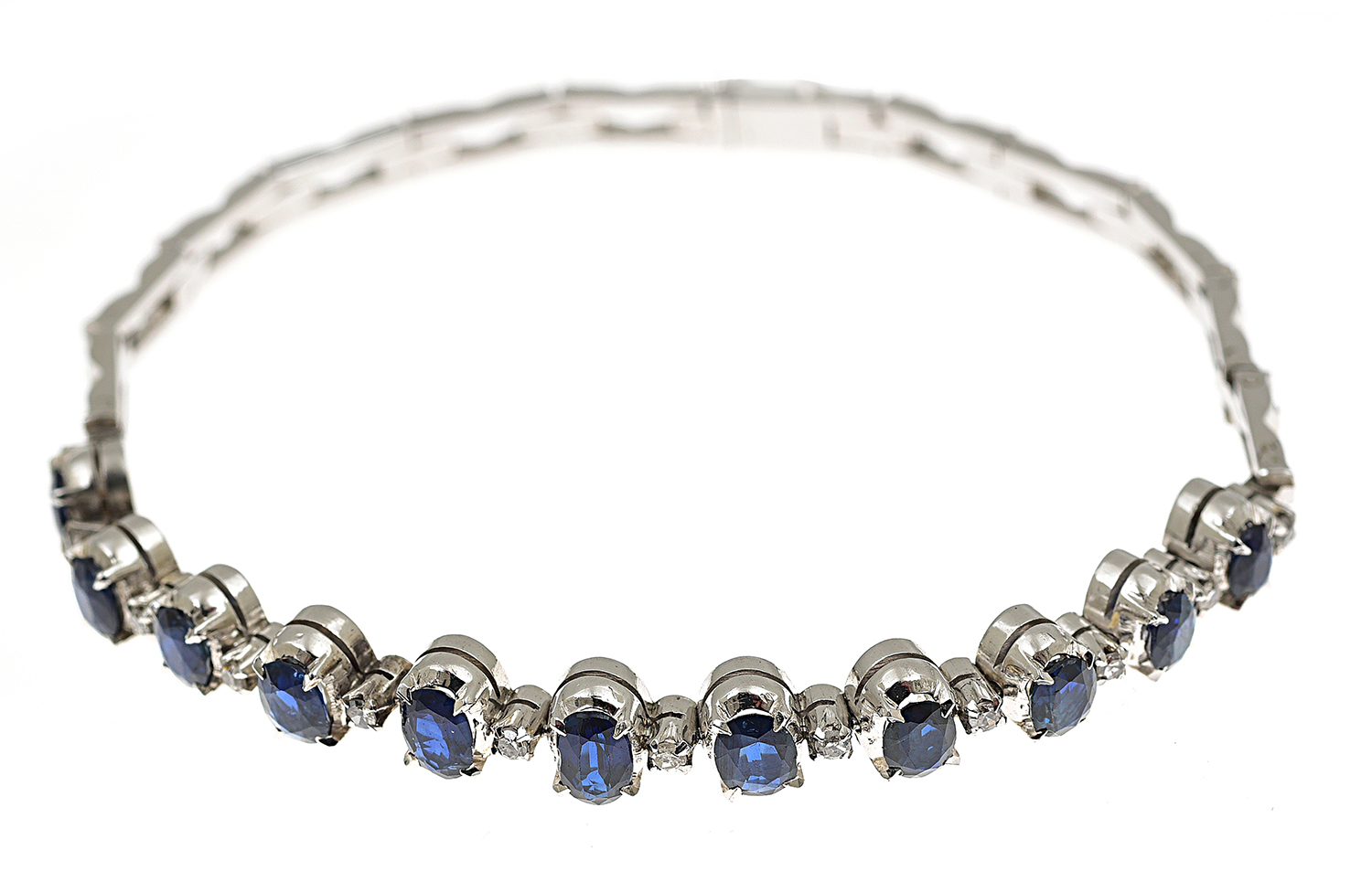 Set with eleven oval cut sapphires interspaced with a single cut diamond, mounted in white gold, total length 180mm.