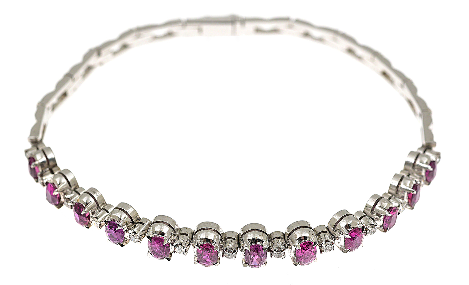 Comprising twelve oval cut rubies interspaced with a single cut diamond, mounted in gold, total length 180mm.