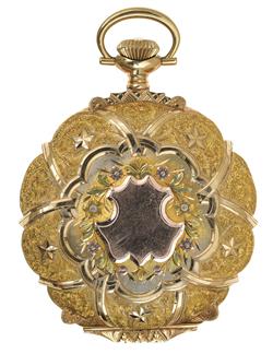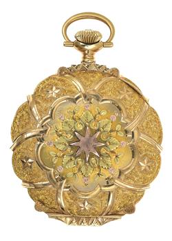 Crown wind lever set movement, circular white dial with black Arabic numerals, subsidiary seconds dial at six, signed dial and movement, ornately engraved boxed hinge case in tri-coloured 14ct gold, case number 513858, 42mm diameter.