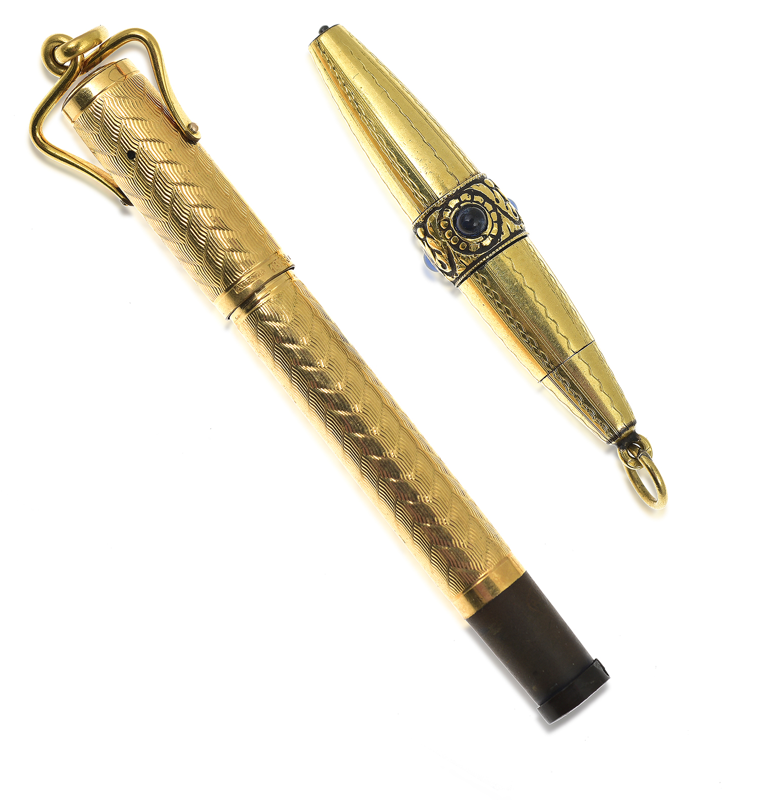 Piece with sapphire decoration is a propelling pencil which does not extend. The other is a fountain pen which is 18ct rolled gold.
