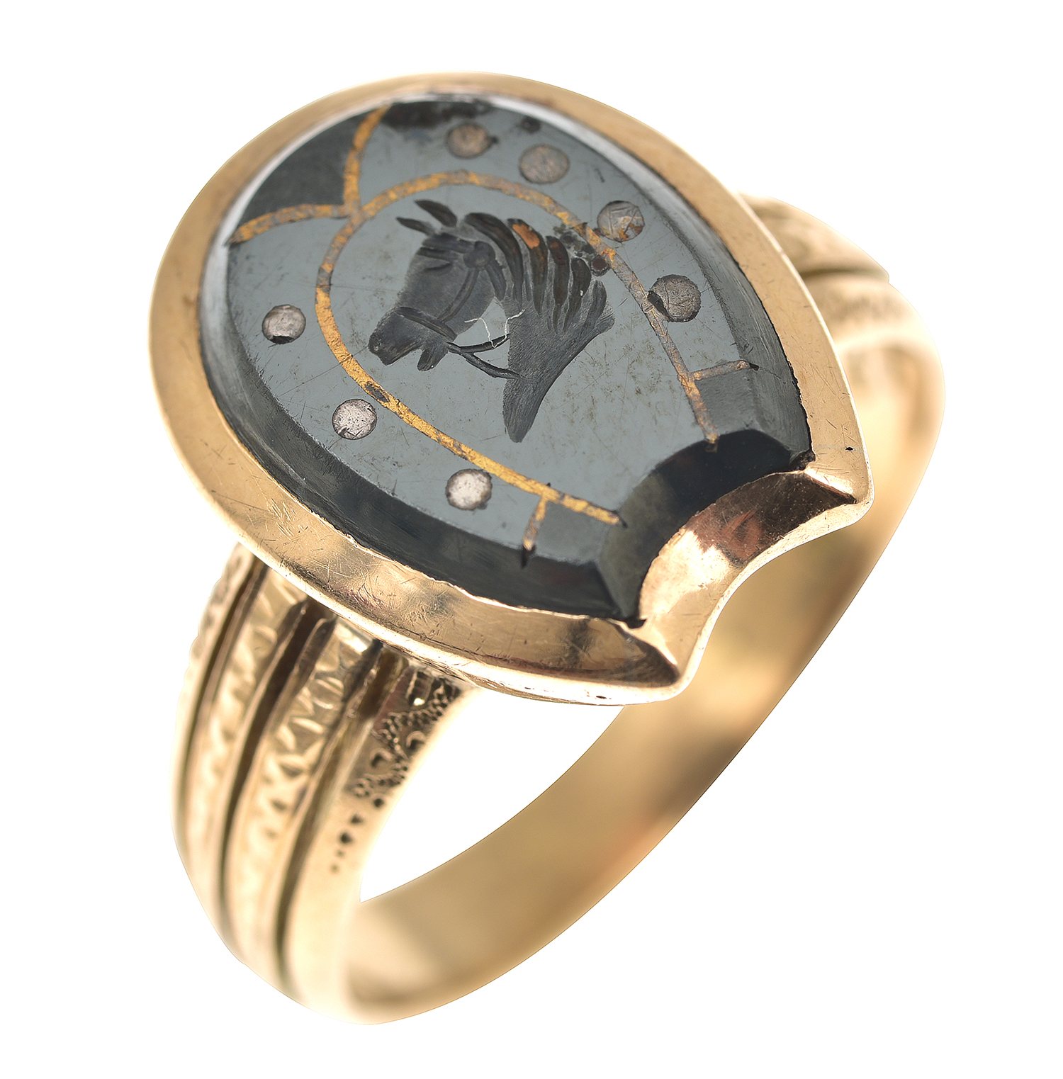 The hematite plaque carved with a horse head within a horse shoe, mounted in 14ct gold, continental hallmarks, ring size S.